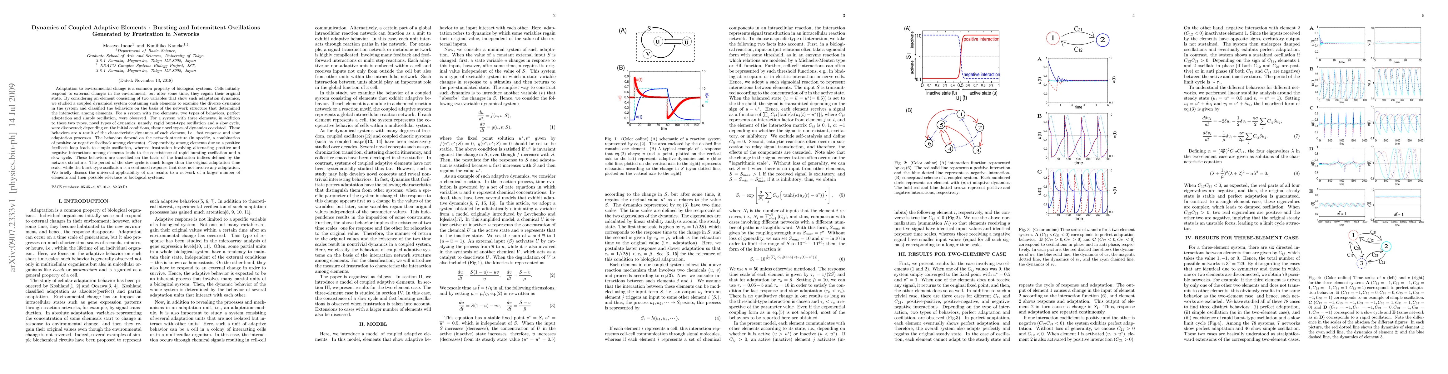 Adaptation to environmental change is a common property of biological systems. Cells initially respond to external changes in the environment, but after some time, they regain their original state. By considering an element consisting of two variables that show such adaptation dynamics, we studied a coupled dynamical system containing such elements to examine the diverse dynamics in the system and classified the behaviors on the basis of the network structure that determined the interaction among elements. For a system with two elements, two types of behaviors, perfect adaptation and simple oscillation, were observed. For a system with three elements, in addition to these two types, novel types of dynamics, namely, rapid burst-type oscillation and a slow cycle, were discovered; depending on the initial conditions, these novel types of dynamics coexisted. These behaviors are a result of the characteristic dynamics of each element, i.e., fast response and slow adaptation processes. The behaviors depend on the network structure (in specific, a combination of positive or negative feedback among elements). Cooperativity among elements due to a positive feedback loop leads to simple oscillation, whereas frustration involving alternating positive and negative interactions among elements leads to the coexistence of rapid bursting oscillation and a slow cycle. These behaviors are classified on the basis of the frustration indices defined by the network structure. The period of the slow cycle is much longer than the original adaptation time scale, while the burst-type oscillation is a continued response that does not involve any adaptation. We briefly discuss the universal applicability of our results to a network of a larger number of elements and their possible relevance to biological systems.