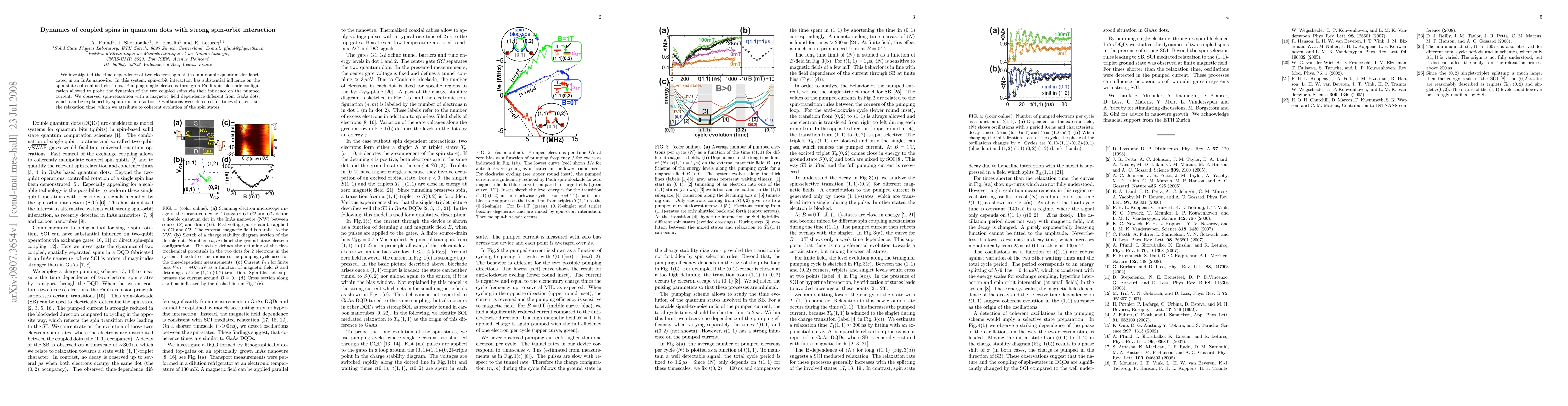 This paper investigates the dynamics of coupled spins in InAs nanowire quantum dots, revealing spin-relaxation and oscillations influenced by strong spin-orbit interaction. The study uses single electron pumping to probe the dynamics, observing distinct magnetic field dependence compared to GaAs dots.
