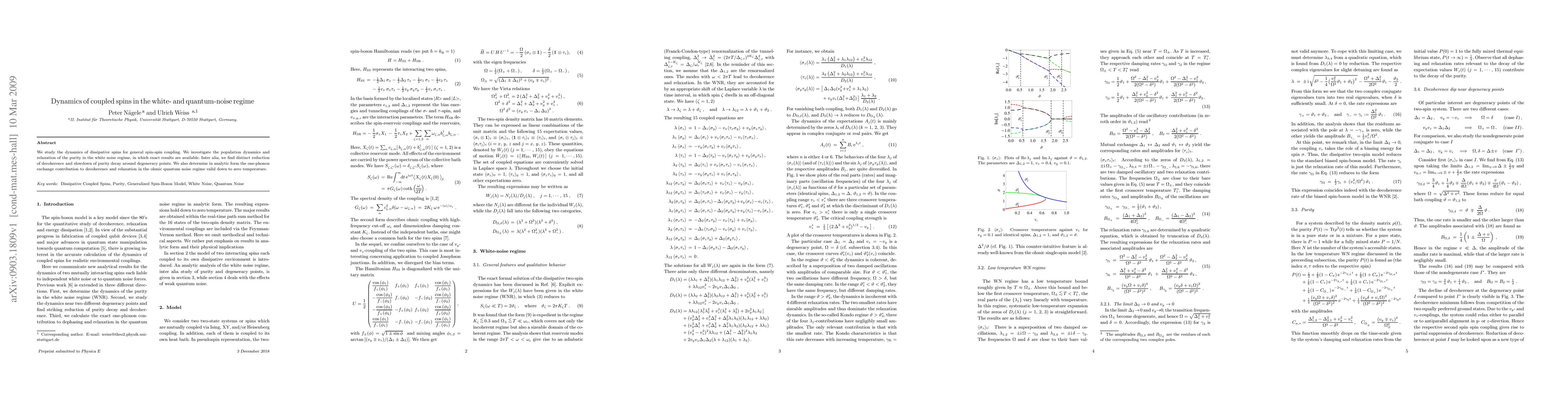 This paper examines the dynamics of coupled dissipative spins under general spin-spin coupling, finding reduced decoherence and slower purity decay near degeneracy points. It also analytically determines the one-phonon exchange contribution to decoherence in the ohmic quantum noise regime, valid at zero temperature.
