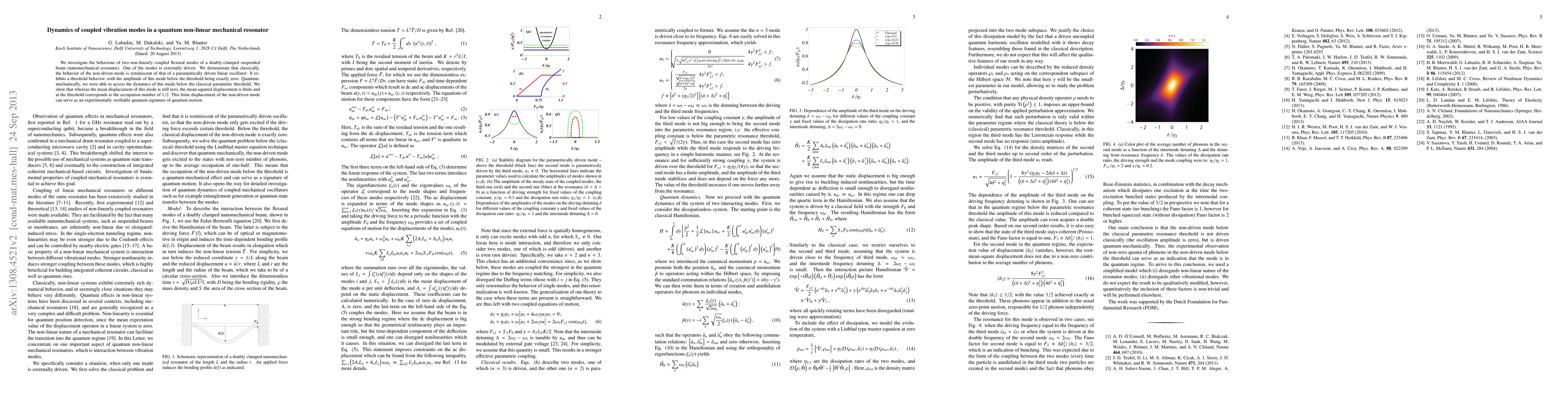We investigate the behaviour of two non-linearly coupled flexural modes of a doubly-clamped suspended beam (nanomechanical resonator). One of the modes is externally driven. We demonstrate that classically, the behavior of the non-driven mode is reminiscent of that of a parametrically driven linear oscillator: It exhibits a threshold behavior, with the amplitude of this mode below the threshold being exactly zero. Quantum-mechanically, we were able to access the dynamics of this mode below the classical parametric threshold. We show that whereas the mean displacement of this mode is still zero, the mean squared displacement is finite and at the threshold corresponds to the occupation number of 1/2. This finite displacement of the non-driven mode can serve as an experimentally verifiable quantum signature of quantum motion.