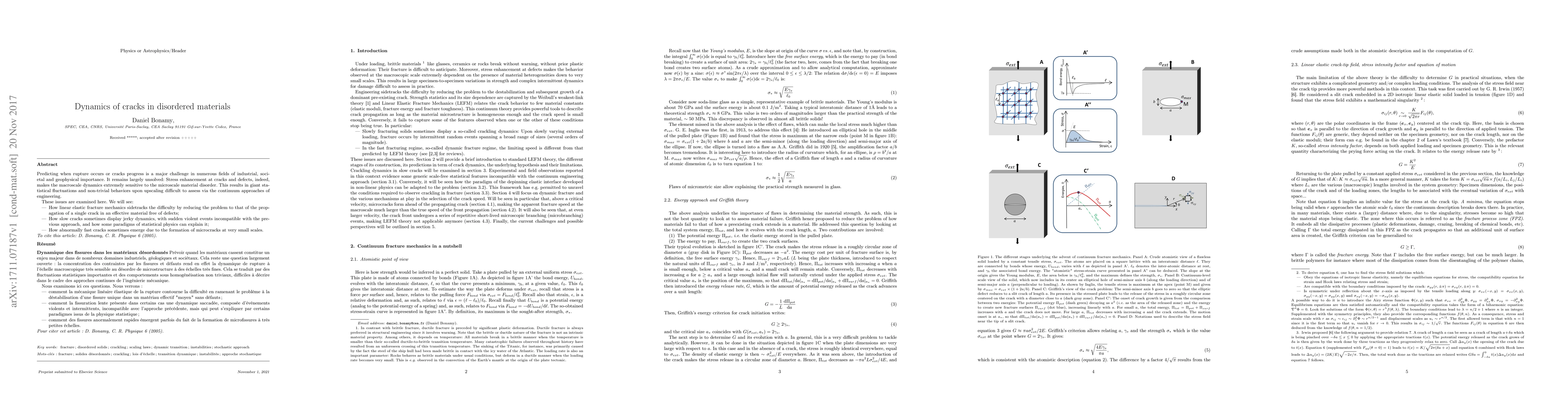 This paper explores the complex dynamics of cracks in disordered materials, highlighting the challenges in predicting rupture due to microscale disorder and stress enhancement. It discusses how linear elastic fracture mechanics oversimplifies the problem, examines jerky crack dynamics, and explores statistical physics paradigms to explain these behaviors.