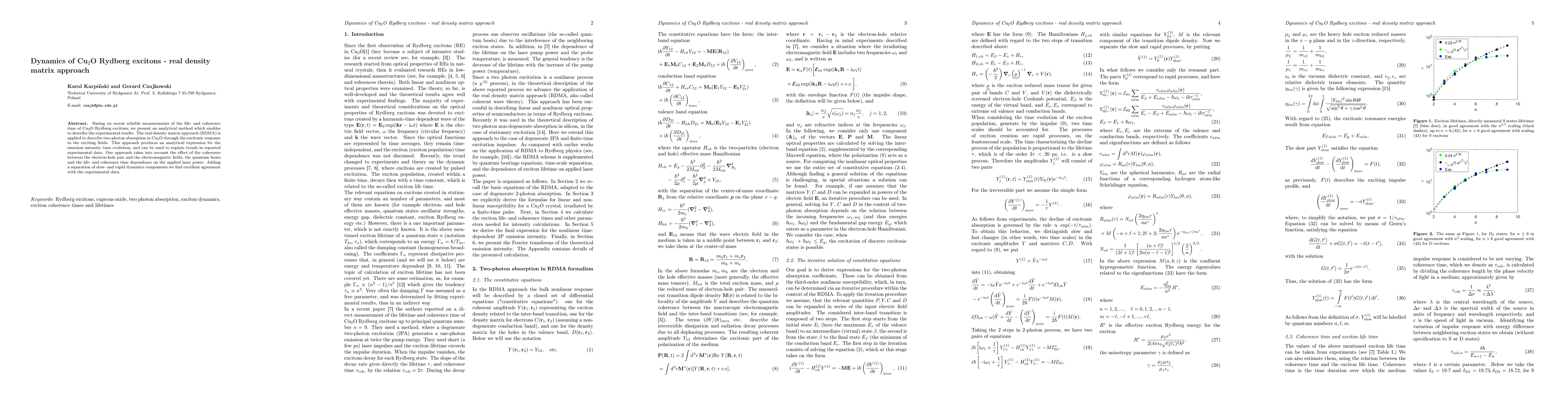 Basing on recent reliable measurements of the life- and coherence time of Cu$_2$O Rydberg excitons, we present an analytical method which enables to describe the experimental results. The real-density matrix approach (RDMA) is applied to describe two-photon absorption in Cu$_2$O through the excitonic response to the exciting fields. This approach produces an analytical expression for the emission intensity time evolution, and can be used to explain trends in reported experimental data. Our approach takes into account the effect of the coherence between the electron-hole pair and the electromagnetic fields, the quantum beats and the life- and coherence time dependence on the applied laser power. Adding a separation of slow- and rapid dynamics components we find excellent agreement with the experimental data.