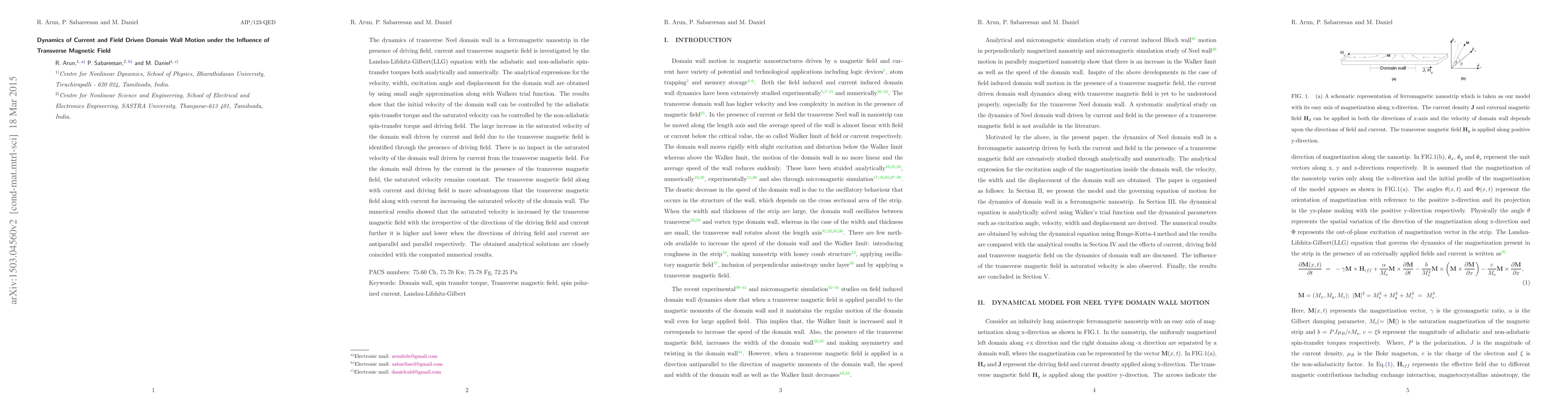 This research investigates the dynamics of a transverse Neel domain wall in ferromagnetic nanostrips under the influence of current, driving field, and transverse magnetic field using the Landau-Lifshitz-Gilbert equation. Analytical and numerical analyses show that the initial domain wall velocity is controlled by adiabatic spin-transfer torque, while saturated velocity is influenced by non-adiabatic spin-transfer torque and the driving field, with the transverse magnetic field further enhancing velocity.