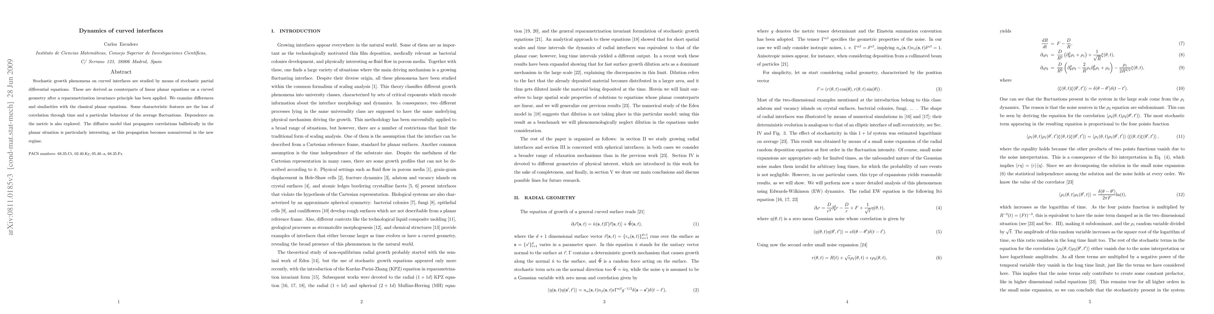 Researchers study stochastic growth on curved interfaces using partial differential equations, finding unique features such as lost correlation over time and nonuniversal behavior.