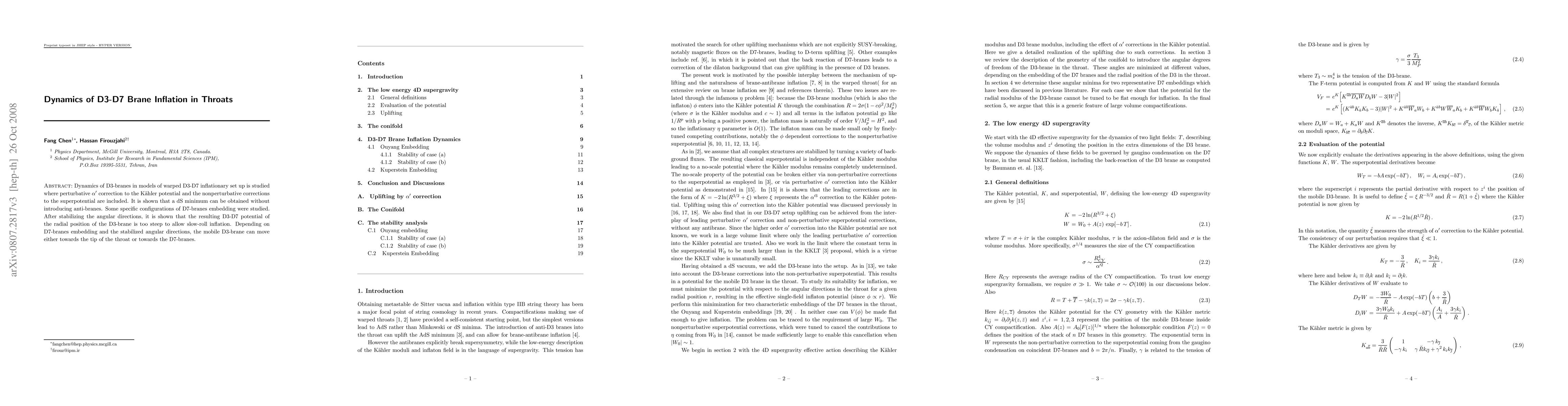 This paper investigates the dynamics of D3-branes in a warped D3-D7 inflationary model, including $\alpha'$ corrections and nonperturbative effects. It finds that a de Sitter minimum can be achieved without anti-branes, but the D3-D7 potential is too steep for slow-roll inflation, depending on D7-brane configurations and stabilized angular directions.