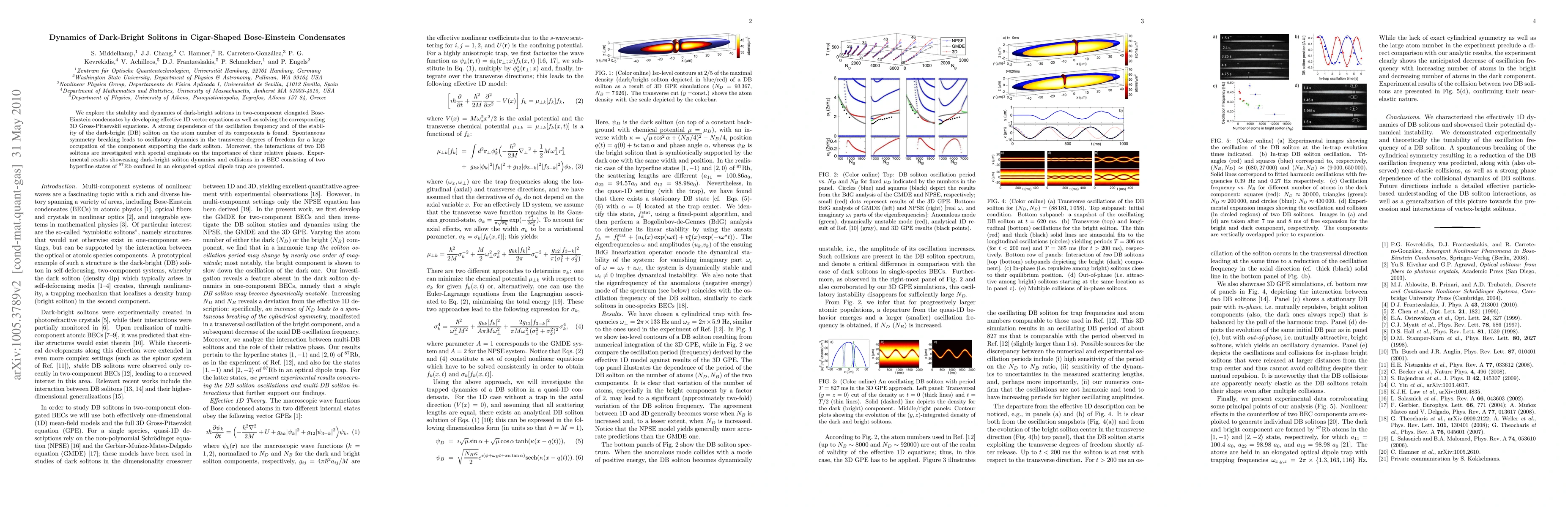 This study investigates the dynamics and stability of dark-bright solitons in elongated Bose-Einstein condensates, revealing their dependence on atom number and interactions, with experiments demonstrating soliton behavior in a $^{87}$Rb BEC.