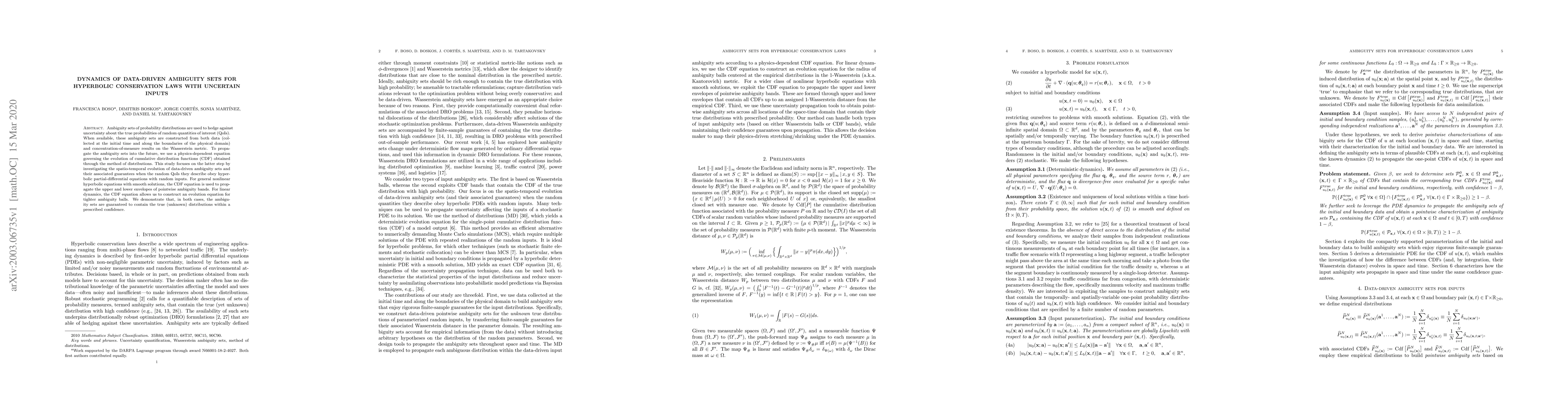 This paper explores the propagation of data-driven ambiguity sets for hyperbolic conservation laws with uncertain inputs, using a physics-dependent equation for cumulative distribution functions. It demonstrates that these sets can reliably contain true distributions for both nonlinear and linear dynamics.