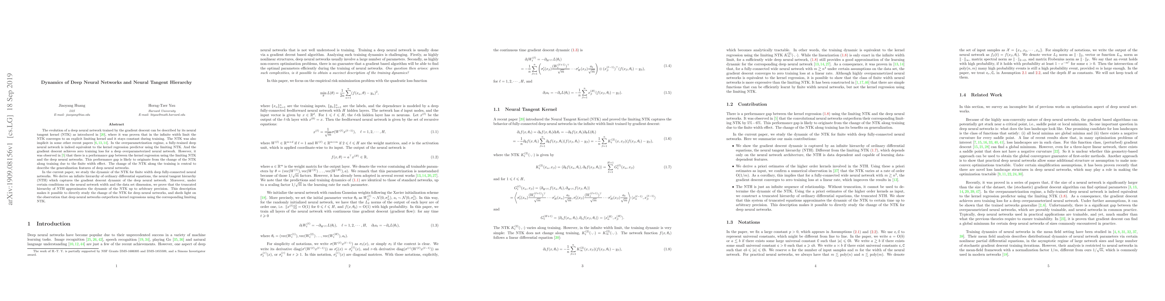 This paper investigates the dynamics of the neural tangent kernel (NTK) during the training of finite width deep neural networks using gradient descent. It introduces the neural tangent hierarchy (NTH), a set of differential equations that approximates the NTK's evolution, explaining the performance gap between neural networks and kernel regressions using the limiting NTK.