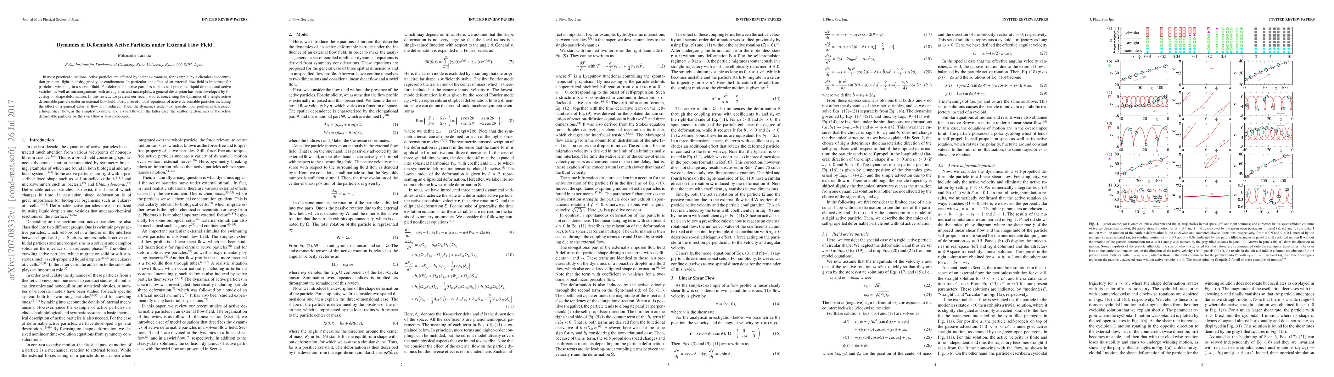 This paper reviews the dynamics of deformable active particles, such as liquid droplets and microorganisms, under external flow fields. It introduces model equations for these particles and discusses their behavior under linear shear and swirl flows, including the scattering dynamics in swirl flow.
