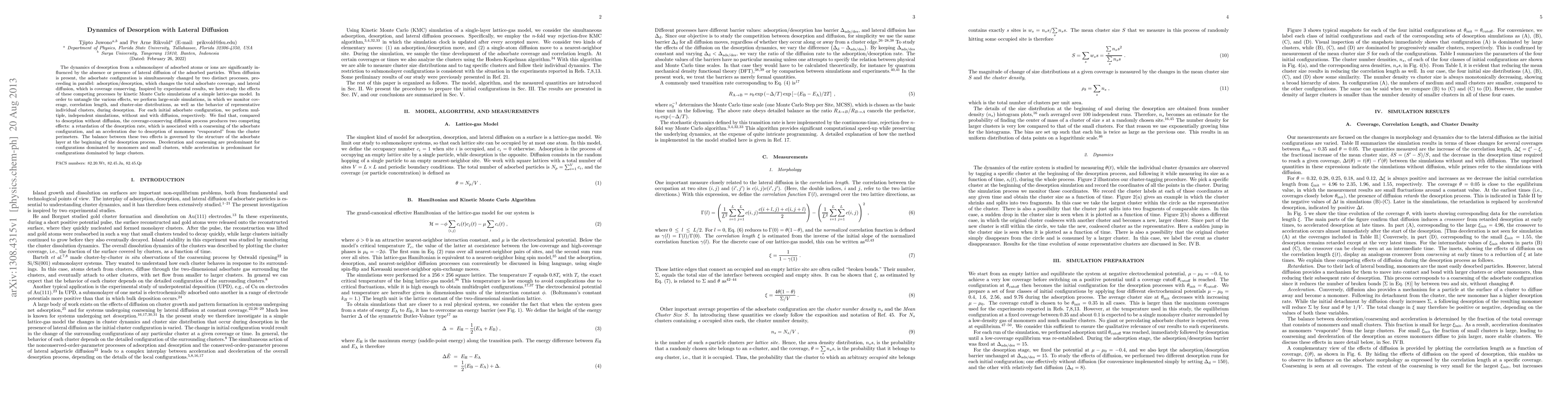 Desorption from a submonolayer of adsorbed atoms or ions is influenced by lateral diffusion, which can either slow down or speed up the process depending on the initial configuration of the adsorbate layer.