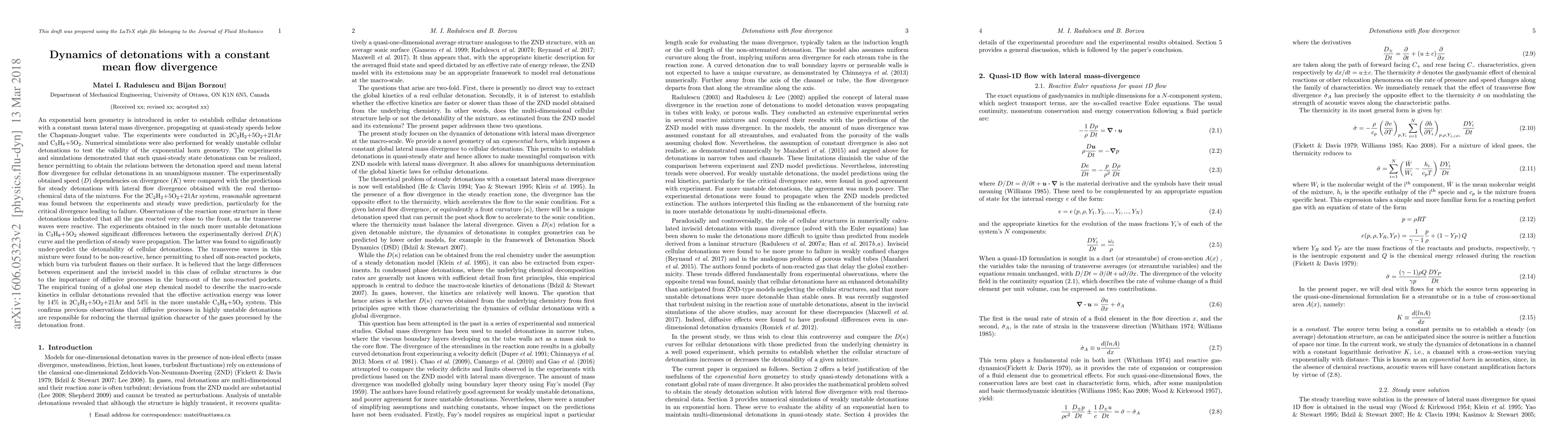 An exponential horn geometry is introduced in order to establish cellular detonations with a constant mean lateral mass divergence, propagating at quasi-steady speeds below the Chapman-Jouguet value. Experiments and simulations demonstrated that such quasi-steady state detonations can be realized, hence permitting to obtain the relations between the detonation speed and mean lateral flow divergence for cellular detonations in an unambiguous manner. The experimentally obtained speed ($D$) dependencies on divergence ($K$) were compared with the predictions for steady detonations with lateral flow divergence obtained with the real thermo-chemical data of the mixtures. For the 2C$_2$H$_2$+5O$_2$+21Ar system, reasonable agreement was found between the experiments and steady wave prediction, particularly for the critical divergence leading to failure. Observations of the reaction zone structure in these detonations indicated that all the gas reacted very close to the front, as the transverse waves were reactive. The experiments obtained in the much more unstable detonations in C$_3$H$_8$+5O$_2$ showed significant differences between the experimentally derived $D(K)$ curve and the prediction of steady wave propagation. The latter was found to significantly under-predict the detonability of cellular detonations. The transverse waves in this mixture were found to be non-reactive, hence permitting to shed off non-reacted pockets, which burn via turbulent flames on their surface. It is believed that the large differences between experiment and the inviscid model in this class of cellular structures is due to the importance of diffusive processes in the burn-out of the non-reacted pockets.