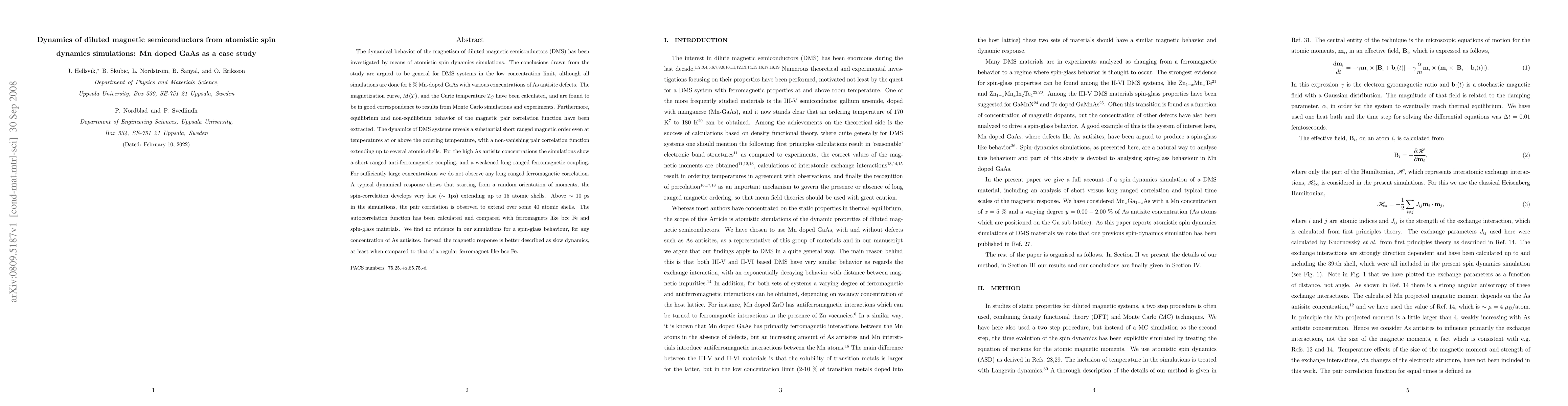 The dynamical behavior of the magnetism of diluted magnetic semiconductors (DMS) has been investigated by means of atomistic spin dynamics simulations. The conclusions drawn from the study are argued to be general for DMS systems in the low concentration limit, although all simulations are done for 5% Mn-doped GaAs with various concentrations of As antisite defects. The magnetization curve, $M(T)$, and the Curie temperature $T_C$ have been calculated, and are found to be in good correspondence to results from Monte Carlo simulations and experiments. Furthermore, equilibrium and non-equilibrium behavior of the magnetic pair correlation function have been extracted. The dynamics of DMS systems reveals a substantial short ranged magnetic order even at temperatures at or above the ordering temperature, with a non-vanishing pair correlation function extending up to several atomic shells. For the high As antisite concentrations the simulations show a short ranged anti-ferromagnetic coupling, and a weakened long ranged ferromagnetic coupling. For sufficiently large concentrations we do not observe any long ranged ferromagnetic correlation. A typical dynamical response shows that starting from a random orientation of moments, the spin-correlation develops very fast ($\sim$ 1ps) extending up to 15 atomic shells. Above $\sim$ 10 ps in the simulations, the pair correlation is observed to extend over some 40 atomic shells. The autocorrelation function has been calculated and compared with ferromagnets like bcc Fe and spin-glass materials. We find no evidence in our simulations for a spin-glass behaviour, for any concentration of As antisites. Instead the magnetic response is better described as slow dynamics, at least when compared to that of a regular ferromagnet like bcc Fe.
