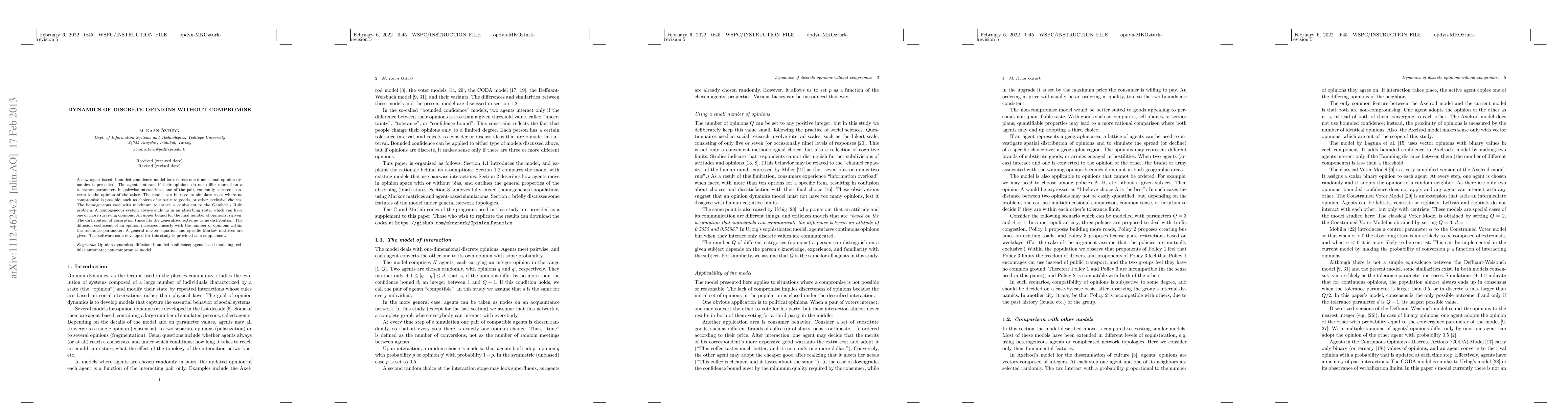 A new model simulates discrete opinions without compromise, predicting a final distribution of absorbing states with an upper bound on the number of surviving opinions. The diffusion coefficient increases linearly with the tolerance parameter.