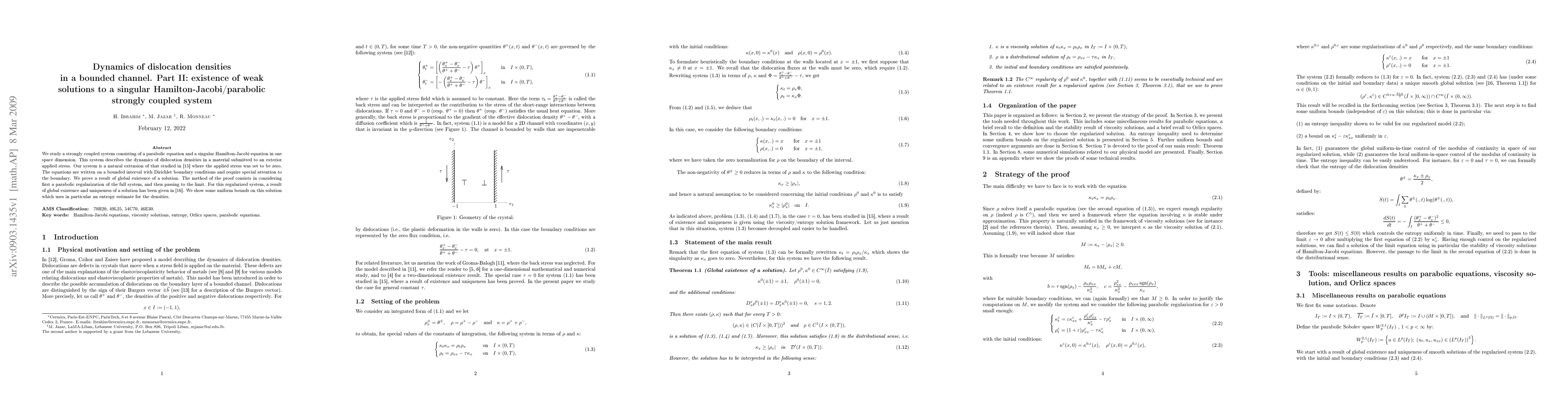 This paper investigates the dynamics of dislocation densities in a bounded channel through a coupled system of a parabolic and a singular Hamilton-Jacobi equation. It proves the global existence of weak solutions by first regularizing the system and then taking the limit, utilizing entropy estimates to establish uniform bounds.