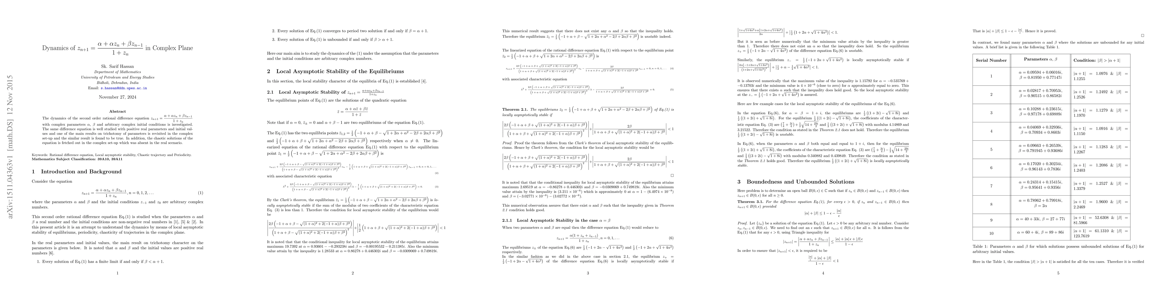 The dynamics of the second order rational difference equation $\displaystyle{z_{n+1}=\frac{\alpha + \alpha z_{n}+\beta z_{n-1}}{1+z_{n}}}$ with complex parameters $\alpha$, $\beta$ and arbitrary complex initial conditions is investigated. The same difference equation is well studied with positive real parameters and initial values and one of the main results on trichotomy of parameters is revisited in the complex set-up and the similar result is found to be true. In addition, the chaotic solutions of the equation is fetched out in the complex set-up which was absent in the real scenario.