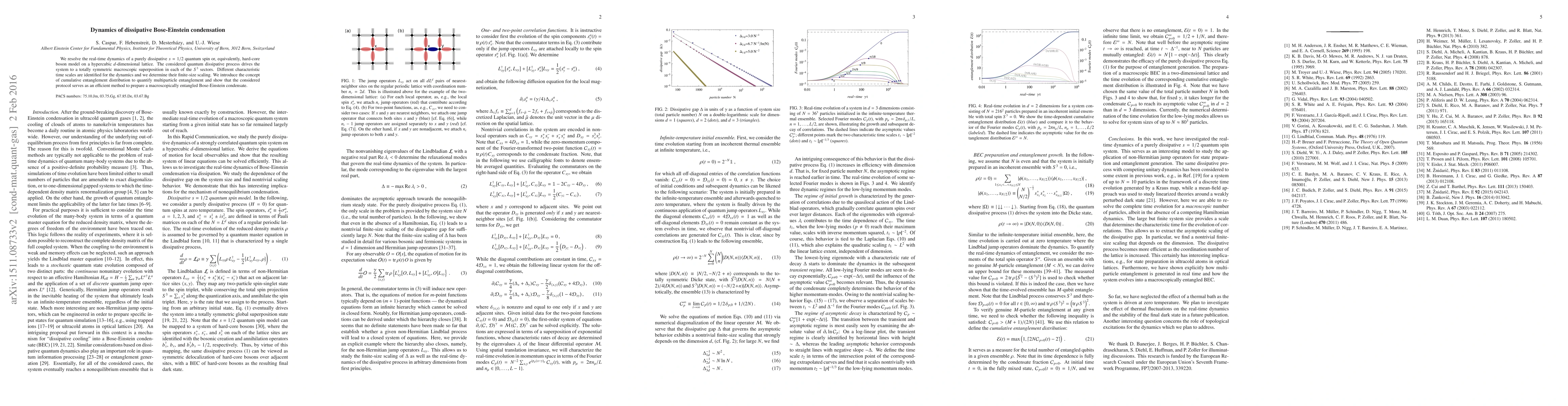 This paper investigates the real-time dynamics of a dissipative quantum spin model on a hypercubic lattice, identifying distinct time scales and their finite-size scaling. It demonstrates the system's ability to achieve macroscopic entanglement, proposing a method for preparing entangled Bose-Einstein condensates.