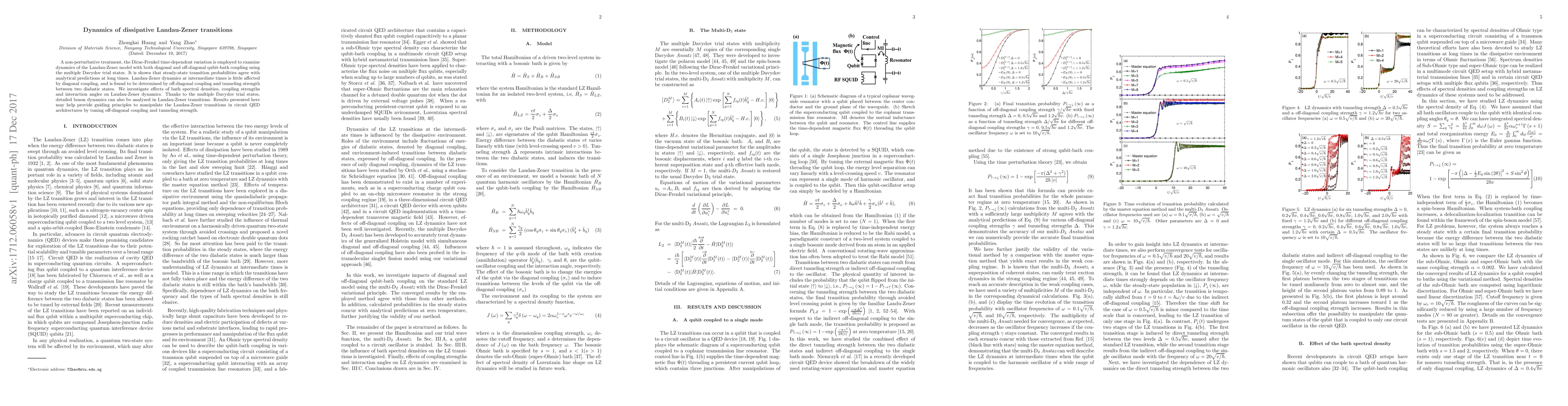 A non-perturbative treatment, the Dirac-Frenkel time-dependent variation is employed to examine dynamics of the Landau-Zener model with both diagonal and off-diagonal qubit-bath coupling using the multiple Davydov trial states. It is shown that steady-state transition probabilities agree with analytical predictions at long times. Landau-Zener dynamics at intermediate times is little affected by diagonal coupling, and is found to be determined by off-diagonal coupling and tunneling strength between two diabatic states. We investigate effects of bath spectral densities, coupling strengths and interaction angles on Laudau-Zener dynamics. Thanks to the multiple Davydov trial states, detailed boson dynamics can also be analyzed in Landau-Zener transitions. Results presented here may help provide guiding principles to manipulate the Laudau-Zener transitions in circuit QED architectures by tuning off-diagonal coupling and tunneling strength.