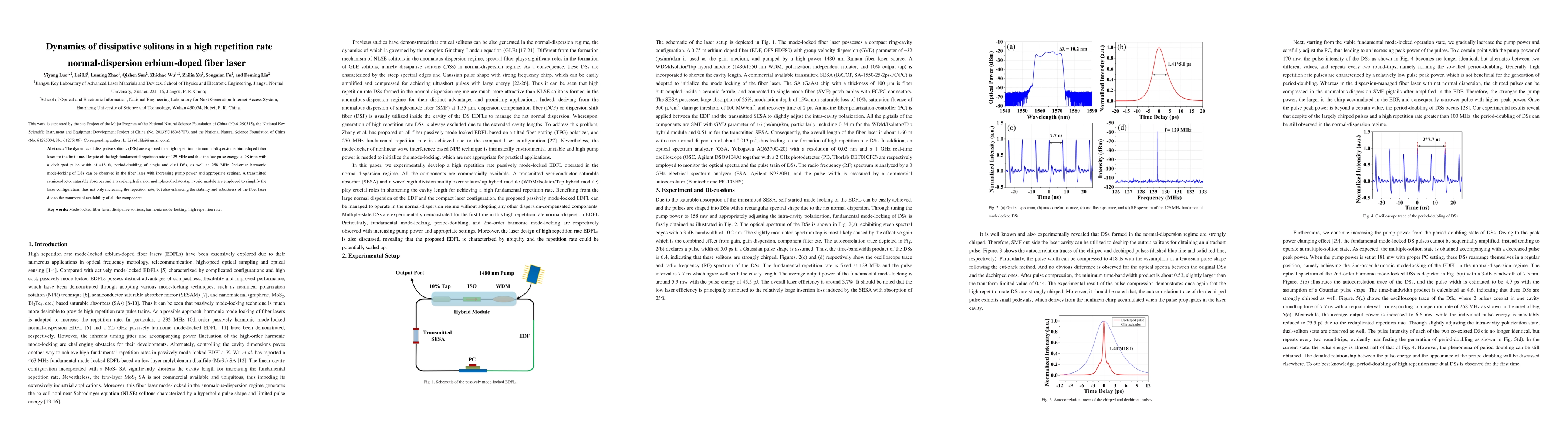 This paper investigates the dynamics of dissipative solitons in a high repetition rate erbium-doped fiber laser operating at 129 MHz. The study observes period-doubling and harmonic mode-locking of solitons, facilitated by a simplified laser configuration using a semiconductor saturable absorber and a hybrid module, enhancing stability and robustness.