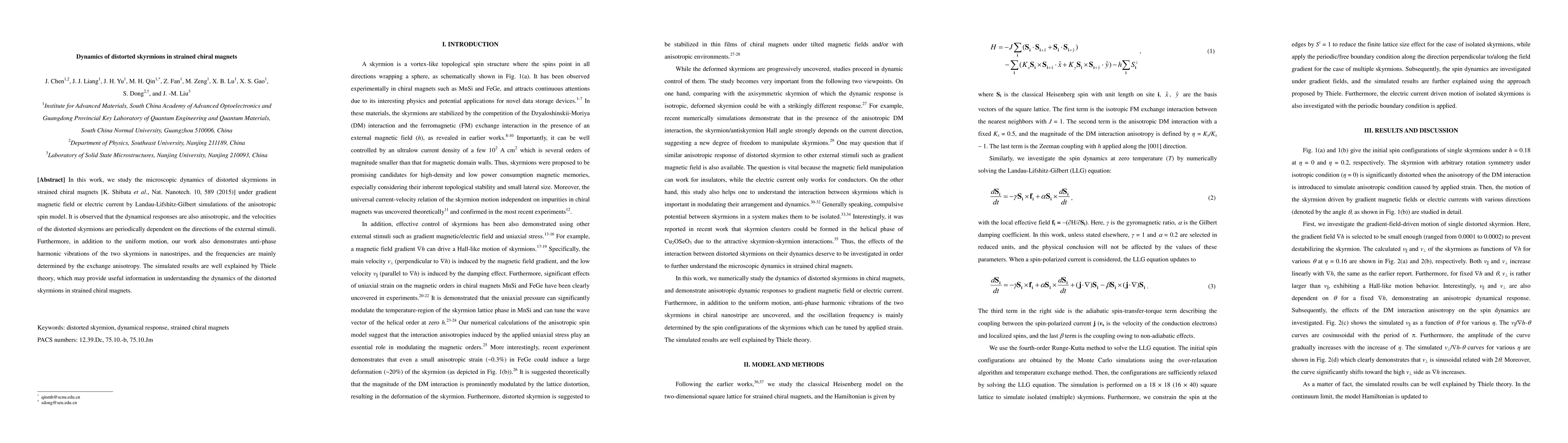 This research investigates the dynamics of distorted skyrmions in strained chiral magnets under external stimuli, revealing anisotropic responses and periodic velocity dependence. The study also uncovers anti-phase vibrations in skyrmions, with frequencies governed by exchange anisotropy, supported by Thiele theory.