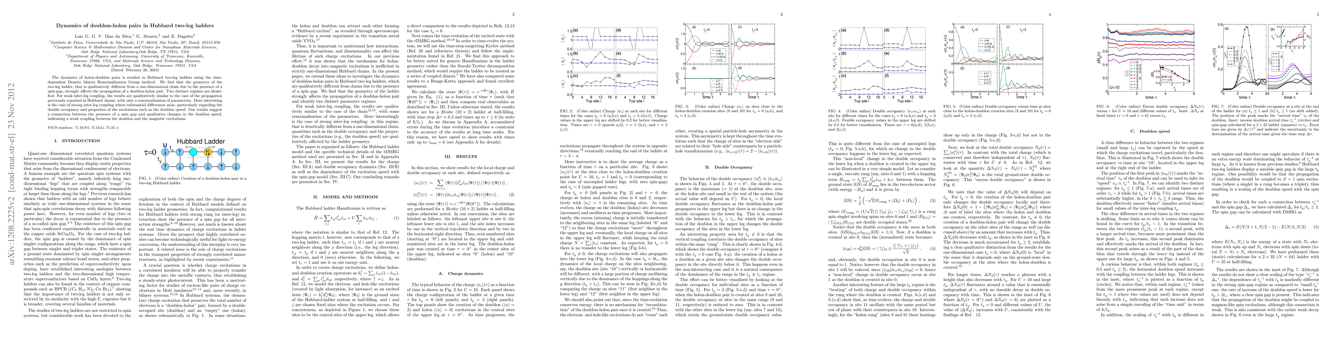 This study investigates the dynamics of holon-doublon pairs in Hubbard two-leg ladders using the time-dependent Density Matrix Renormalization Group method, revealing two distinct regimes. In weak inter-leg coupling, dynamics resemble those in Hubbard chains, while strong coupling shows significant differences, particularly in doublon speed and double occupancy, suggesting a spin gap's influence on magnetic excitation coupling.