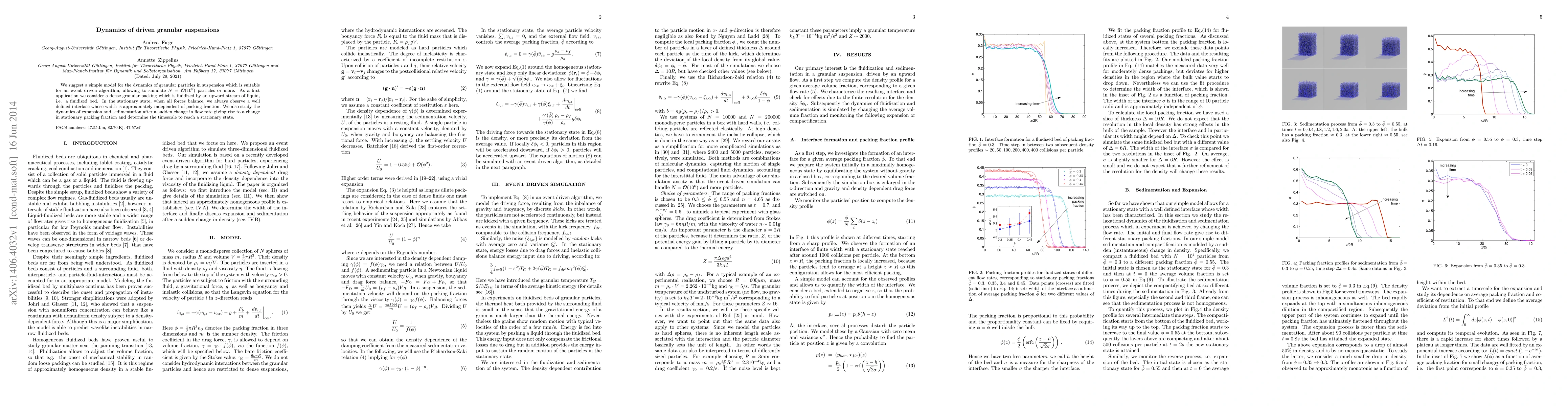We suggest a simple model for the dynamics of granular particles in suspension which is suitable for an event driven algorithm, allowing to simulate $N=\mathcal{O}(10^6)$ particles or more. As a first application we consider a dense granular packing which is fluidized by an upward stream of liquid, i.e. a fluidized bed. In the stationary state, when all forces balance, we always observe a well defined interface whose width is approximately independent of packing fraction. We also study the dynamics of expansion and sedimentation after a sudden change in flow rate giving rise to a change in stationary packing fraction and determine the timescale to reach a stationary state.