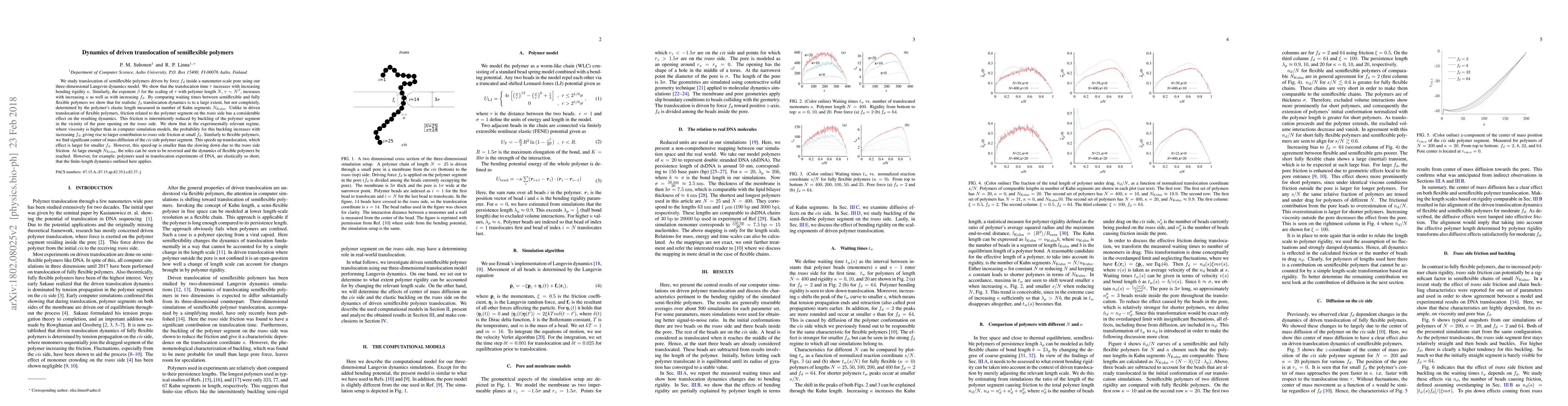 We study translocation of semiflexible polymers driven by force $f_d$ inside a nanometer-scale pore using our three-dimensional Langevin dynamics model. We show that the translocation time $\tau$ increases with increasing bending rigidity $\kappa$. Similarly, the exponent $\beta$ for the scaling of $\tau$ with polymer length $N$, $\tau \sim N^\beta$, increases with increasing $\kappa$ as well as with increasing $f_d$. By comparing waiting times between semiflexible and fully flexible polymers we show that for realistic $f_d$ translocation dynamics is to a large extent, but not completely, determined by the polymer's elastic length measured in number of Kuhn segments $N_{\rm Kuhn}$. Unlike in driven translocation of flexible polymers, friction related to the polymer segment on the trans side has a considerable effect on the resulting dynamics. This friction is intermittently reduced by buckling of the polymer segment in the vicinity of the pore opening on the trans side. We show that in the experimentally relevant regime, where viscosity is higher than in computer simulation models, the probability for this buckling increases with increasing $f_d$, giving rise to larger contribution to trans side friction at small $f_d$. Similarly to flexible polymers, we find significant center of mass diffusion of the cis side polymer segment. This speeds up translocation, which effect is larger for smaller $f_d$. However, this speed-up is smaller than the slowing down due to the trans side friction. At large enough $N_{\rm Kuhn}$, the roles can be seen to be reversed and the dynamics of flexible polymers be reached. However, for example, polymers used in translocation experiments of DNA, are elastically so short, that the finite-length dynamics outlined here applies.