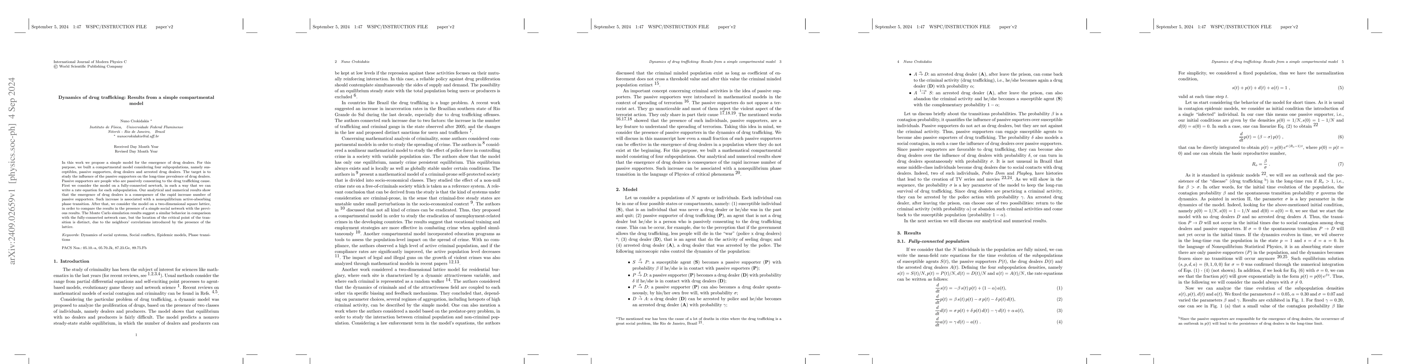 In this work we propose a simple model for the emergence of drug dealers. For this purpose, we built a compartmental model considering four subpopulations, namely susceptibles, passive supporters, drug dealers and arrested drug dealers. The target is to study the influence of the passive supporters on the long-time prevalence of drug dealers. Passive supporters are people who are passively consenting to the drug trafficking cause. First we consider the model on a fully-connected newtork, in such a way that we can write a rate equation for each subpopulation. Our analytical and numerical results show that the emergence of drug dealers is a consequence of the rapid increase number of passive supporters. Such increase is associated with a nonequilibrium active-absorbing phase transition. After that, we consider the model on a two-dimensional square lattice, in order to compare the results in the presence of a simple social network with the previous results. The Monte Carlo simulation results suggest a similar behavior in comparison with the fully-connected network case, but the location of the critical point of the transition is distinct, due to the neighbors' correlations introduced by the presence of the lattice.