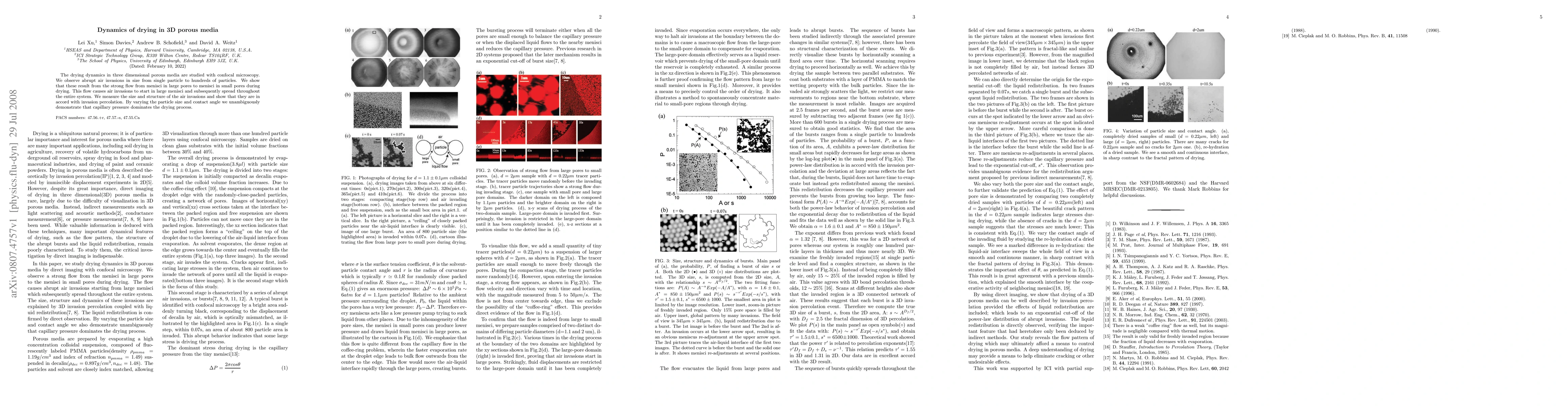 The drying dynamics in three dimensional porous media are studied with confocal microscopy. We observe abrupt air invasions in size from single particle to hundreds of particles. We show that these result from the strong flow from menisci in large pores to menisci in small pores during drying. This flow causes air invasions to start in large menisci and subsequently spread throughout the entire system. We measure the size and structure of the air invasions and show that they are in accord with invasion percolation. By varying the particle size and contact angle we unambiguously demonstrate that capillary pressure dominates the drying process.