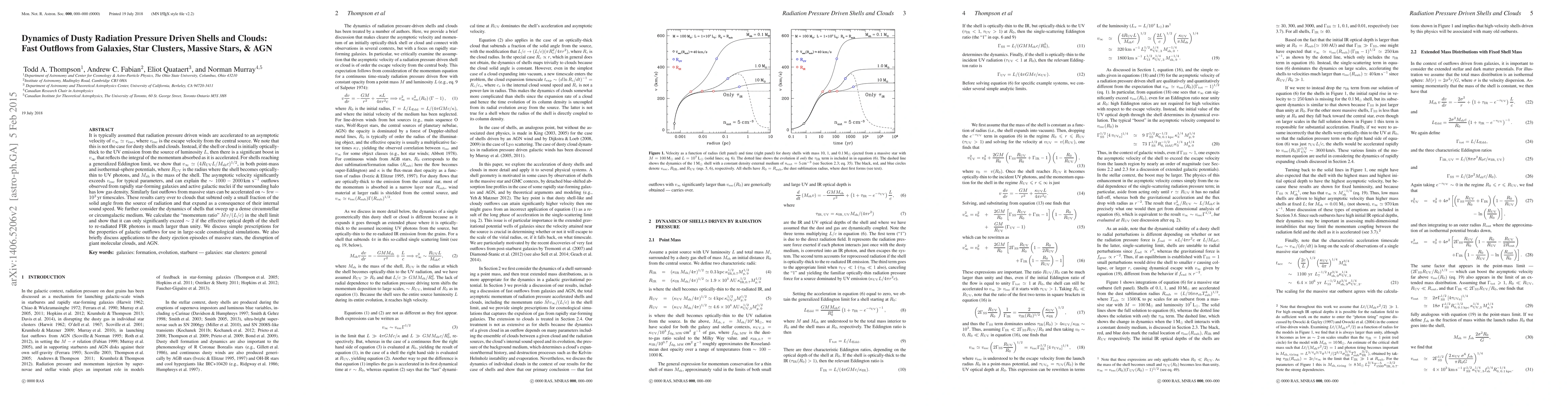 This paper explores the dynamics of radiation pressure driven outflows in dusty shells and clouds, showing that their velocities can significantly exceed escape velocities due to momentum absorption. It provides a formula for the asymptotic velocity in various potentials and discusses implications for outflows in galaxies, star clusters, massive stars, and AGN.