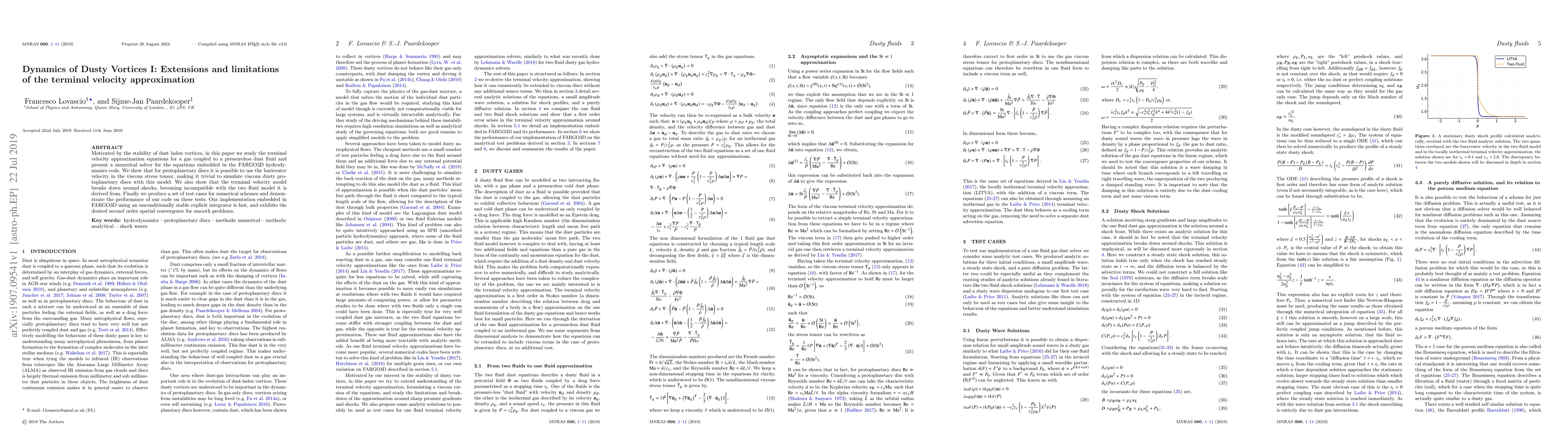 Researchers developed a numerical model to simulate dusty vortices in protoplanetary discs, finding that the terminal velocity approximation breaks down around shocks but can be used to simulate viscous dusty discs with minimal modifications.