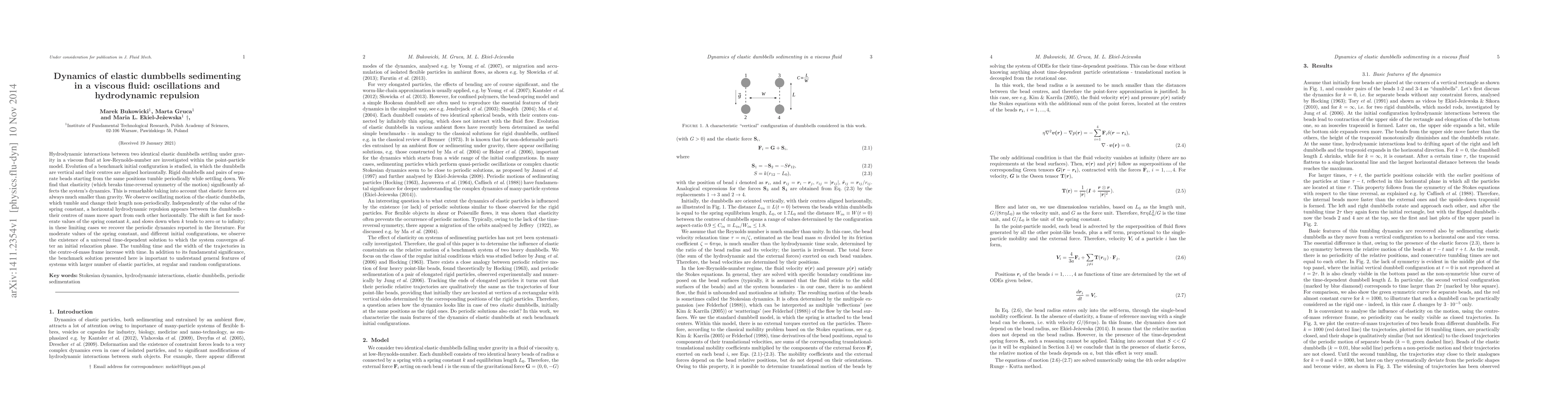 This paper investigates the dynamics of elastic dumbbells in a viscous fluid, focusing on their oscillations and hydrodynamic repulsion. Elasticity significantly alters the system's dynamics, leading to non-periodic tumbling and horizontal separation despite being much smaller than gravitational forces.