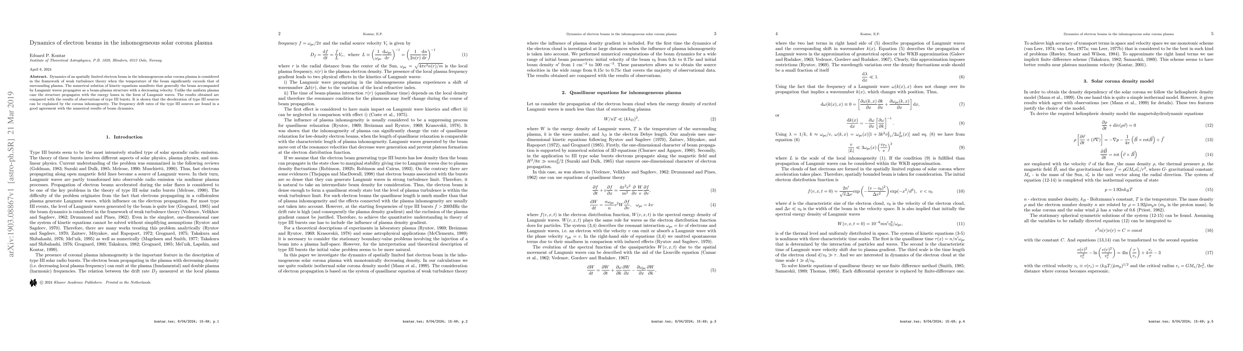 This research explores the dynamics of electron beams in the inhomogeneous solar corona plasma using weak turbulence theory, revealing that beam-plasma structures decelerate due to energy losses as Langmuir waves. The findings correlate well with observations of type III bursts, attributing deceleration to the solar corona's inhomogeneity.
