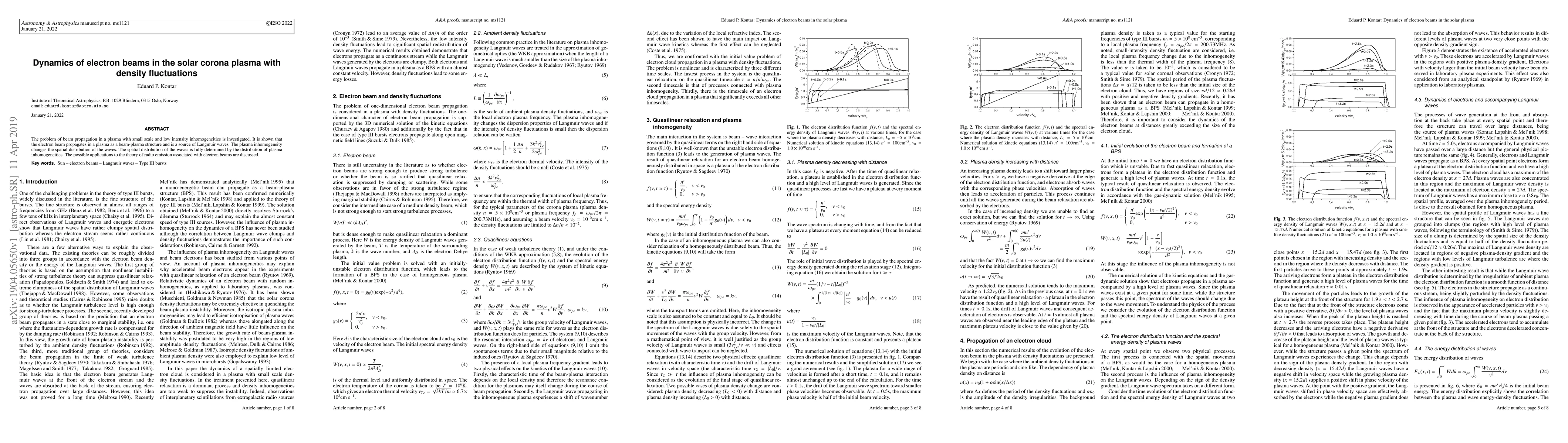 This paper investigates electron beam propagation in solar corona plasma with density fluctuations, demonstrating that the beam generates Langmuir waves whose spatial distribution is influenced by the plasma's inhomogeneities, with potential implications for understanding radio emissions linked to electron beams.