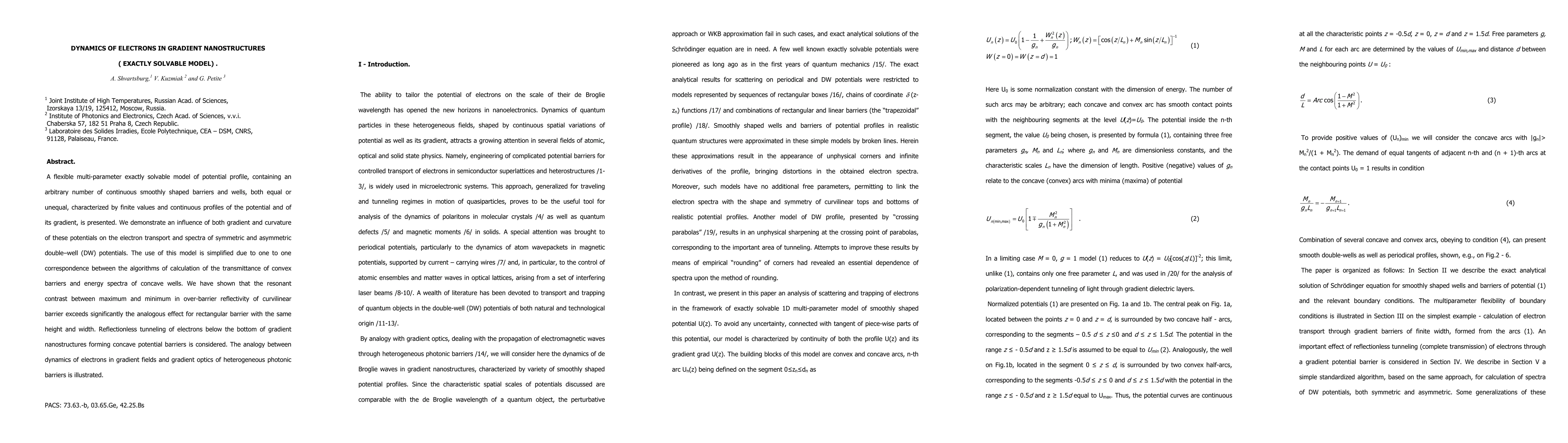 A flexible multi-parameter exactly solvable model of potential profile, containing an arbitrary number of continuous smoothly shaped barriers and wells, both equal or unequal, characterized by finite values and continuous profiles of the potential and of its gradient, is presented. We demonstrate an influence of both gradient and curvature of these potentials on the electron transport and spectra of symmetric and asymmetric double-well (DW) potentials. The use of this model is simplified due to one to one correspondence between the algorithms of calculation of the transmittance of convex barriers and energy spectra of concave wells. We have shown that the resonant contrast between maximum and minimum in over-barrier reflectivity of curvilinear barrier exceeds significantly the analogous effect for rectangular barrier with the same height and width. Reflectionless tunneling of electrons below the bottom of gradient nanostructures forming concave potential barriers is considered. The analogy between dynamics of electrons in gradient fields and gradient optics of heterogeneous photonic barriers is illustrated.