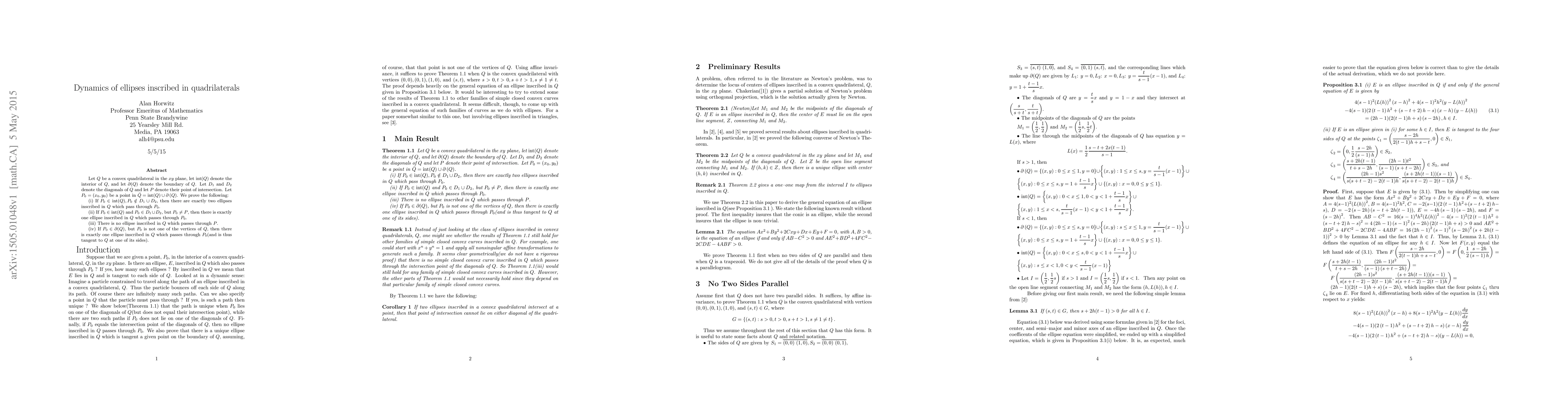 This paper investigates the number of ellipses inscribed within a convex quadrilateral Q based on the location of a point P_0 relative to the diagonals D_1 and D_2. It proves that two ellipses pass through P_0 if it's inside Q but not on the diagonals, one if on a diagonal but not at the intersection, none if at the intersection, and one if on the boundary but not a vertex.