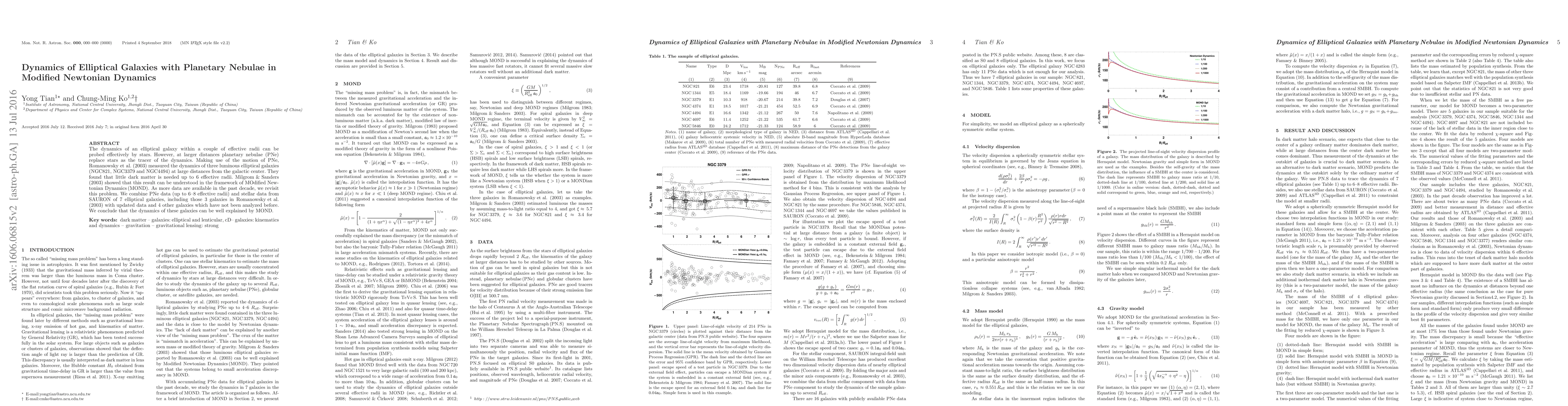 This paper revisits the dynamics of seven elliptical galaxies using planetary nebulae and stellar data, finding that Modified Newtonian Dynamics (MOND) provides a good explanation for the observed motion, with minimal dark matter required at large distances.