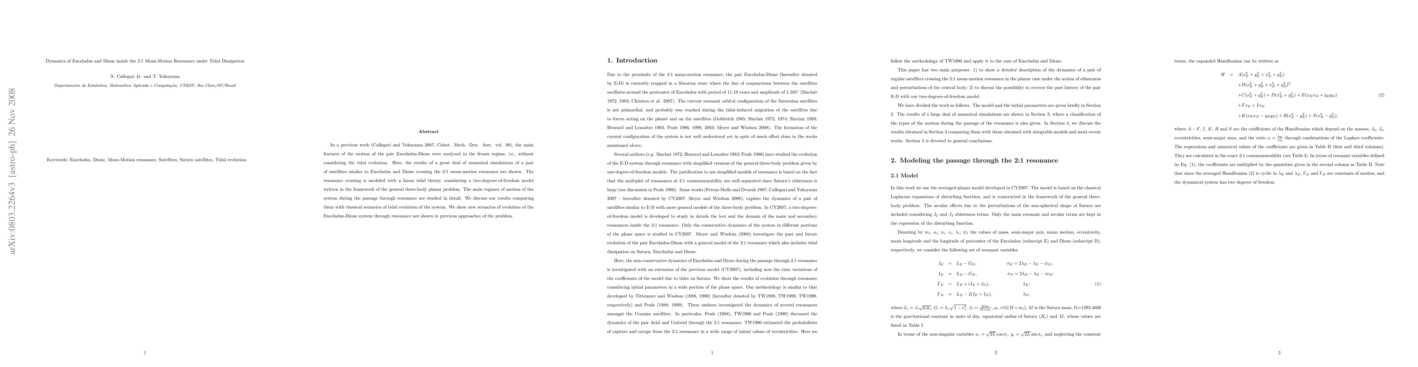 This paper investigates the dynamics of Enceladus and Dione as they cross the 2:1 mean-motion resonance, incorporating tidal dissipation effects through numerical simulations. It reveals new evolutionary scenarios for the system, contrasting with classical tidal evolution models.