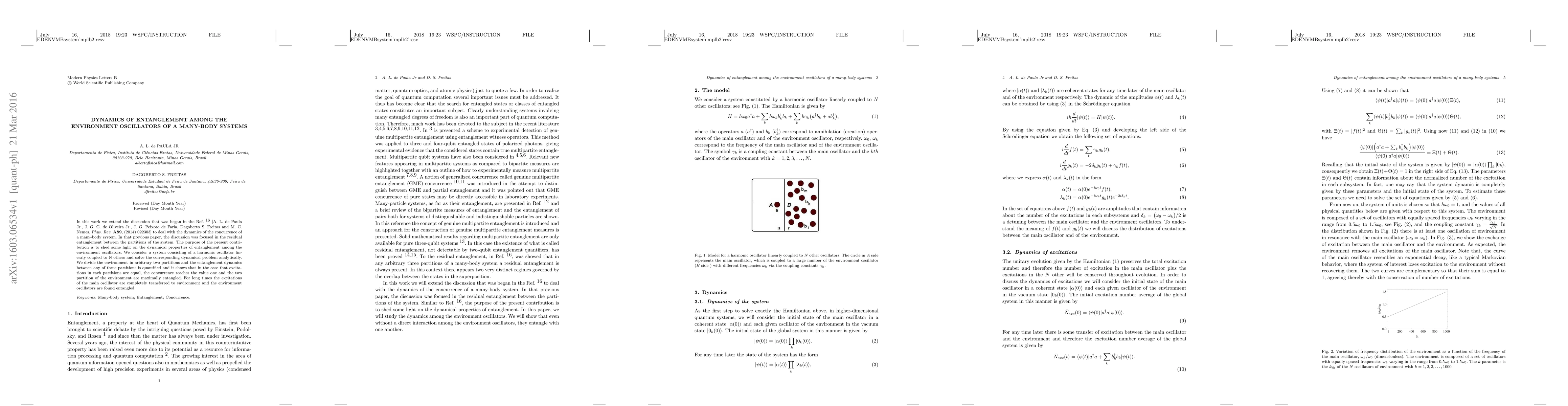This paper investigates the dynamics of entanglement among environment oscillators in many-body systems, extending previous work on residual entanglement. It analytically solves the dynamics of a harmonic oscillator coupled to N others, showing that equal excitations in partitions lead to maximal entanglement, while long-time dynamics result in complete transfer of excitations to the environment, leaving the environment oscillators entangled.