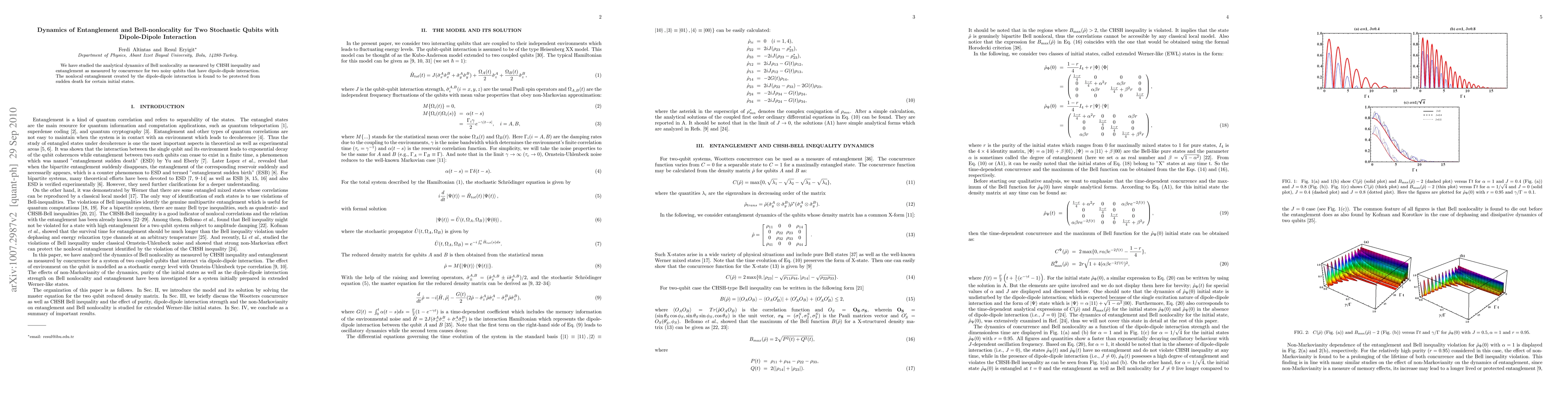 The research employed a theoretical approach to analyze the dynamics of entanglement and Bell-nonlocality for two stochastic qubits with dipole-dipole interaction.