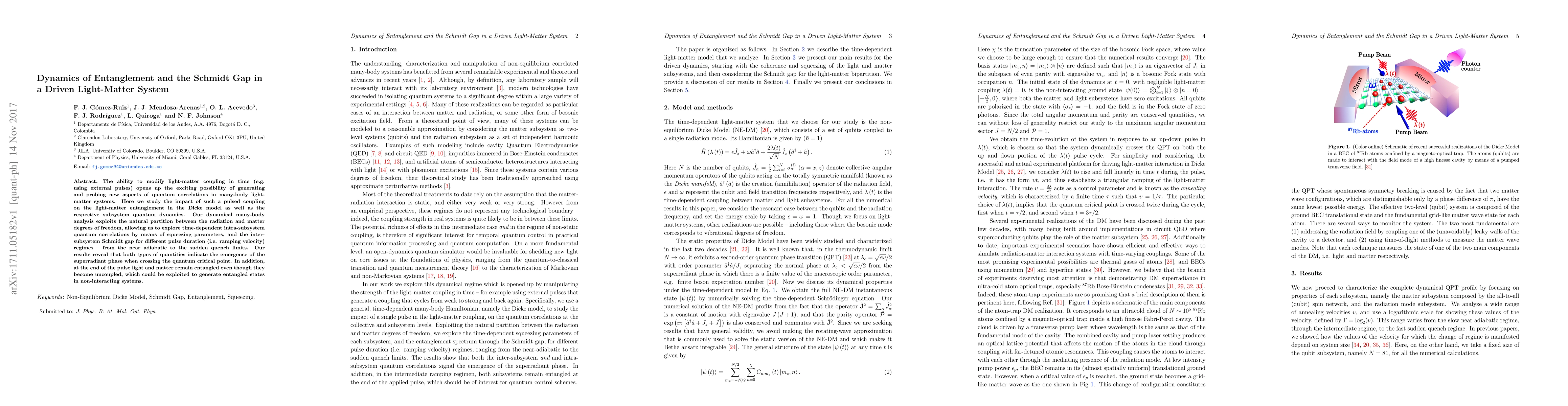 The ability to modify light-matter coupling in time (e.g. using external pulses) opens up the exciting possibility of generating and probing new aspects of quantum correlations in many-body light-matter systems. Here we study the impact of such a pulsed coupling on the light-matter entanglement in the Dicke model as well as the respective subsystem quantum dynamics. Our dynamical many-body analysis exploits the natural partition between the radiation and matter degrees of freedom, allowing us to explore time-dependent intra-subsystem quantum correlations by means of squeezing parameters, and the inter-subsystem Schmidt gap for different pulse duration (i.e. ramping velocity) regimes -- from the near adiabatic to the sudden quench limits. Our results reveal that both types of quantities indicate the emergence of the superradiant phase when crossing the quantum critical point. In addition, at the end of the pulse light and matter remain entangled even though they become uncoupled, which could be exploited to generate entangled states in non-interacting systems.