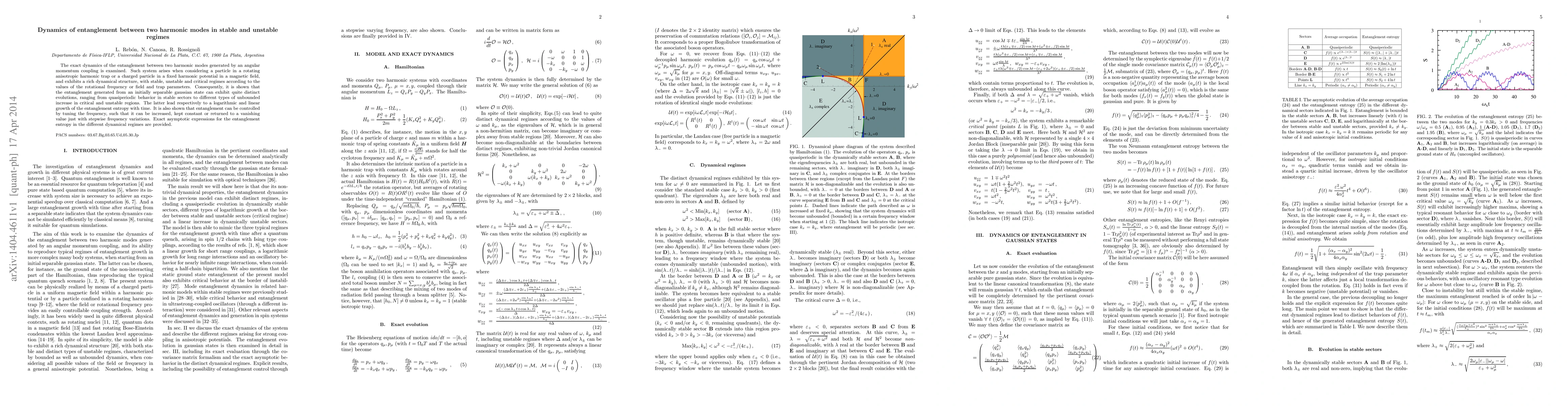 This paper investigates the entanglement dynamics between two harmonic modes linked via angular momentum, revealing distinct behaviors in stable, unstable, and critical regimes. The study shows that entanglement can evolve from quasiperiodic to unbounded growth, with logarithmic and linear increases in critical and unstable regions, respectively, and can be controlled by adjusting the frequency.