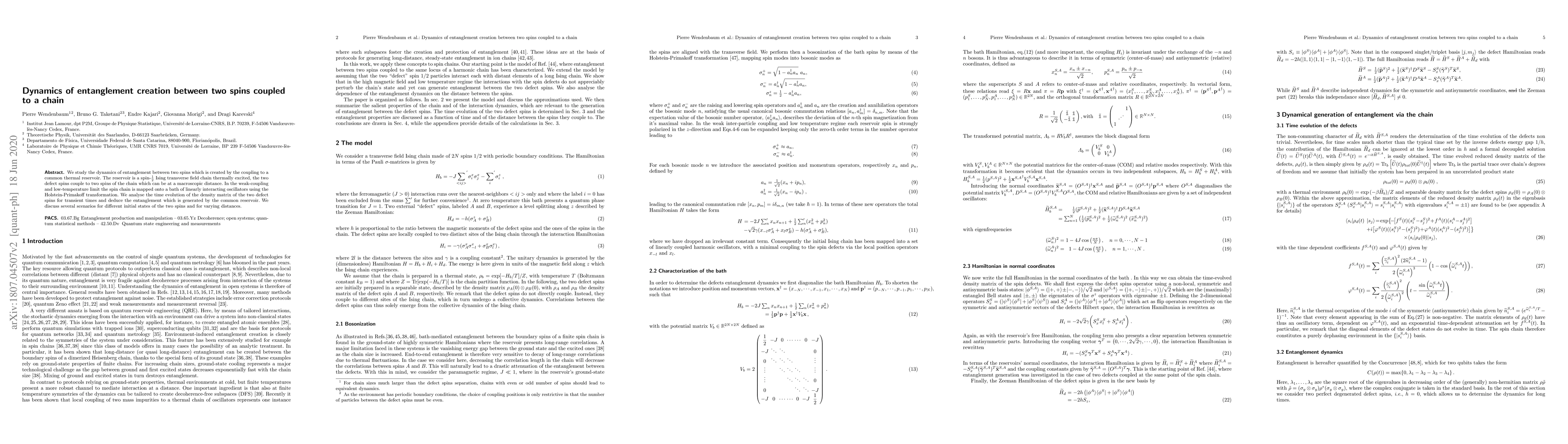This paper investigates the creation of entanglement between two distant spins coupled to a thermal Ising chain via a common thermal reservoir. Using the Holstein-Primakoff transformation, the authors analyze the time evolution of the density matrix and explore entanglement dynamics under various initial conditions and distances.