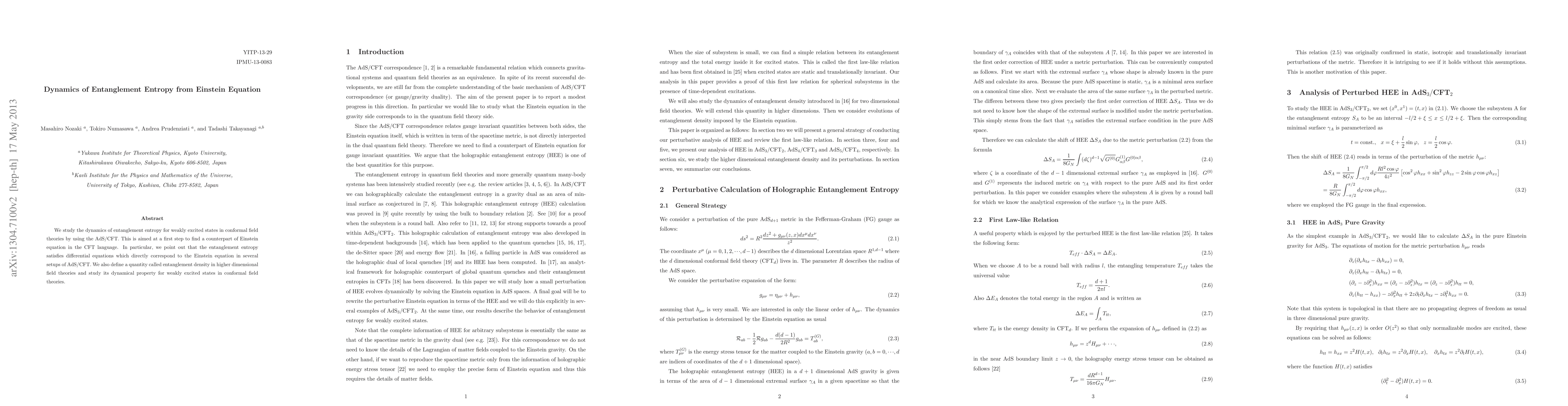 This paper investigates the dynamics of entanglement entropy in conformal field theories using the AdS/CFT correspondence, revealing that entanglement entropy obeys differential equations analogous to Einstein's equations in certain setups. It also introduces and analyzes the entanglement density in higher-dimensional field theories for weakly excited states.