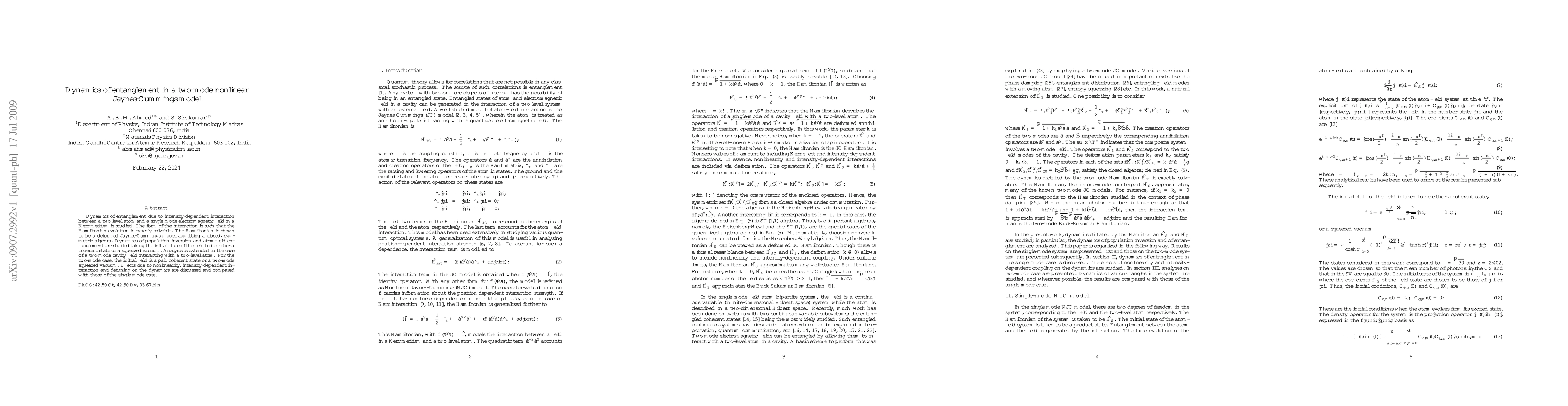 This paper studies the dynamics of entanglement in a two-mode nonlinear Jaynes-Cummings model, where a two-level atom interacts with a Kerr medium's electromagnetic field. The model's Hamiltonian allows for exact solutions and analysis of entanglement, population inversion, and effects of nonlinearity and detuning.