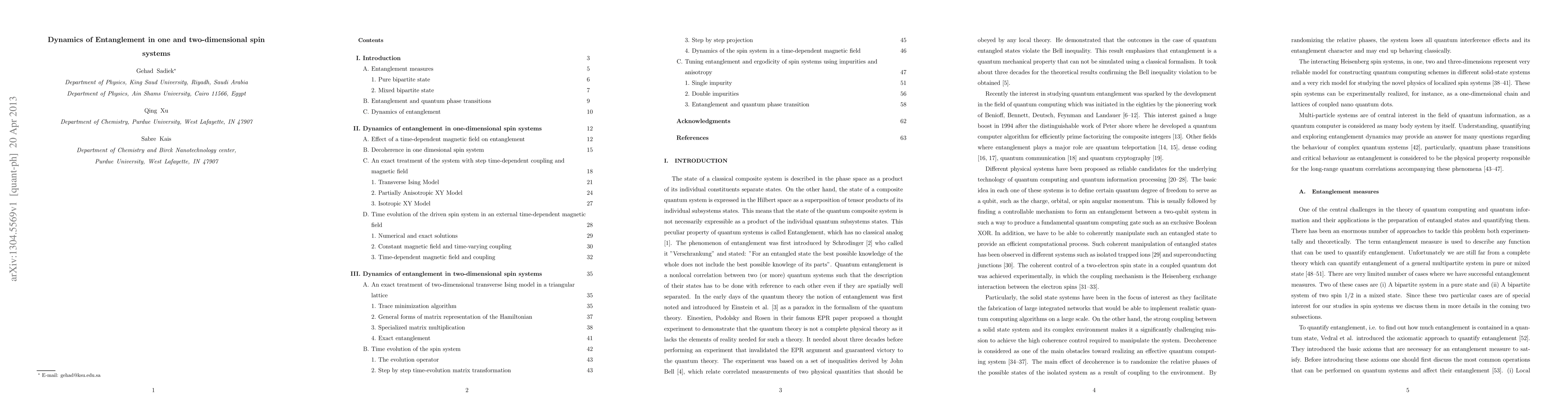 This paper reviews the dynamics of entanglement in one and two-dimensional spin systems influenced by external magnetic fields and varying anisotropy levels at both zero and finite temperatures. It discusses methods for handling large Hilbert space dimensions, including trace minimization, time-evolution matrix transformation, and step-by-step projection techniques.