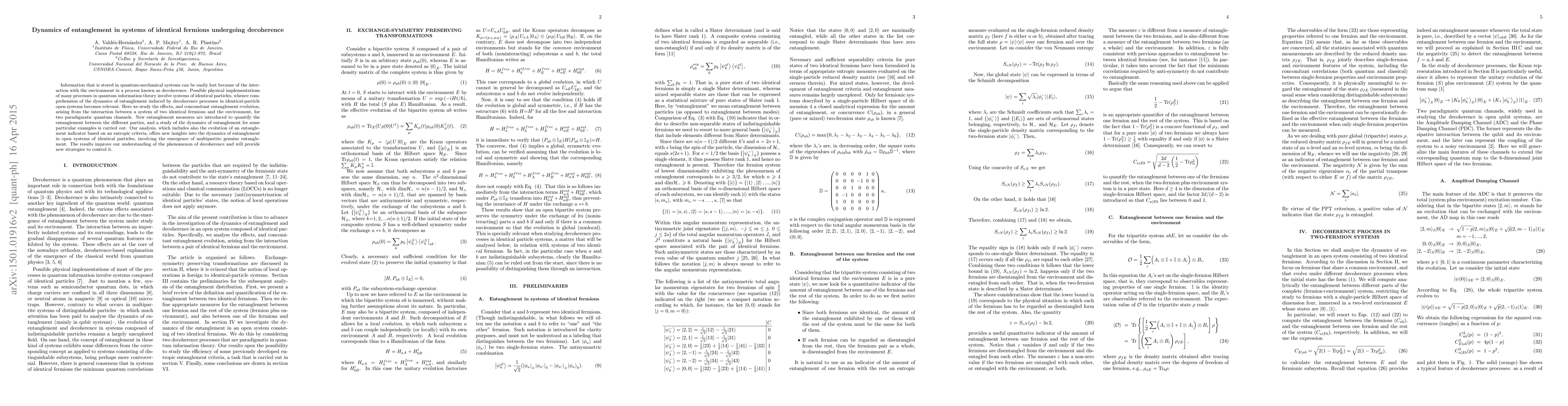 This paper investigates the dynamics of entanglement in systems of identical fermions subjected to decoherence, introducing new entanglement measures to quantify the effects. It explores the evolution of entanglement through interactions with the environment, revealing insights into multipartite genuine entanglement and offering strategies to control decoherence.