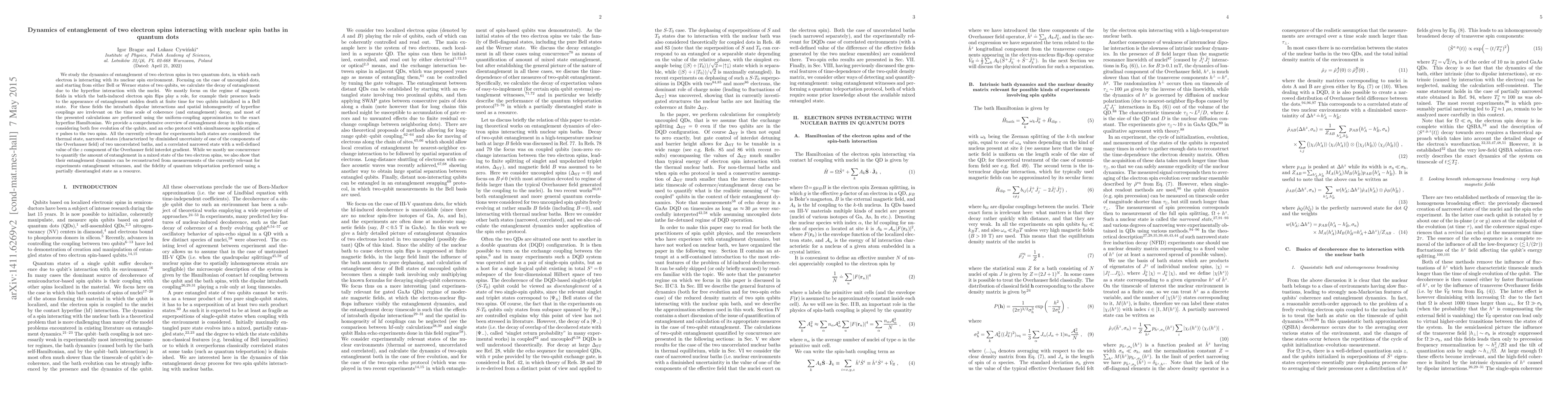 This paper investigates the dynamics of entanglement decay between two electron spins in quantum dots, each interacting with its nuclear spin environment. It focuses on uncoupled dots and explores entanglement decay due to hyperfine interactions, particularly in magnetic fields where bath-induced electron spin flips occur, leading to entanglement sudden death. The study considers various bath states and uses concurrence and entanglement witnesses to quantify entanglement.