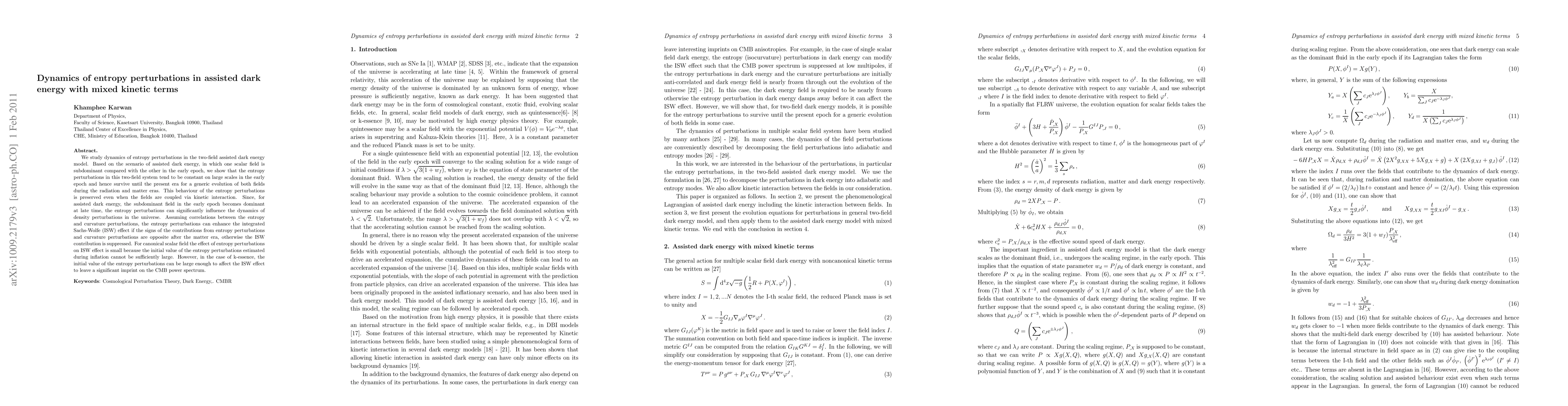 We study dynamics of entropy perturbations in the two-field assisted dark energy model. Based on the scenario of assisted dark energy, in which one scalar field is subdominant compared with the other in the early epoch, we show that the entropy perturbations in this two-field system tend to be constant on large scales in the early epoch and hence survive until the present era for a generic evolution of both fields during the radiation and matter eras. This behaviour of the entropy perturbations is preserved even when the fields are coupled via kinetic interaction. Since, for assisted dark energy, the subdominant field in the early epoch becomes dominant at late time, the entropy perturbations can significantly influence the dynamics of density perturbations in the universe. Assuming correlations between the entropy and curvature perturbations, the entropy perturbations can enhance the integrated Sachs-Wolfe (ISW) effect if the signs of the contributions from entropy perturbations and curvature perturbations are opposite after the matter era, otherwise the ISW contribution is suppressed. For canonical scalar field the effect of entropy perturbations on ISW effect is small because the initial value of the entropy perturbations estimated during inflation cannot be sufficiently large. However, in the case of k-essence, the initial value of the entropy perturbations can be large enough to affect the ISW effect to leave a significant imprint on the CMB power spectrum.
