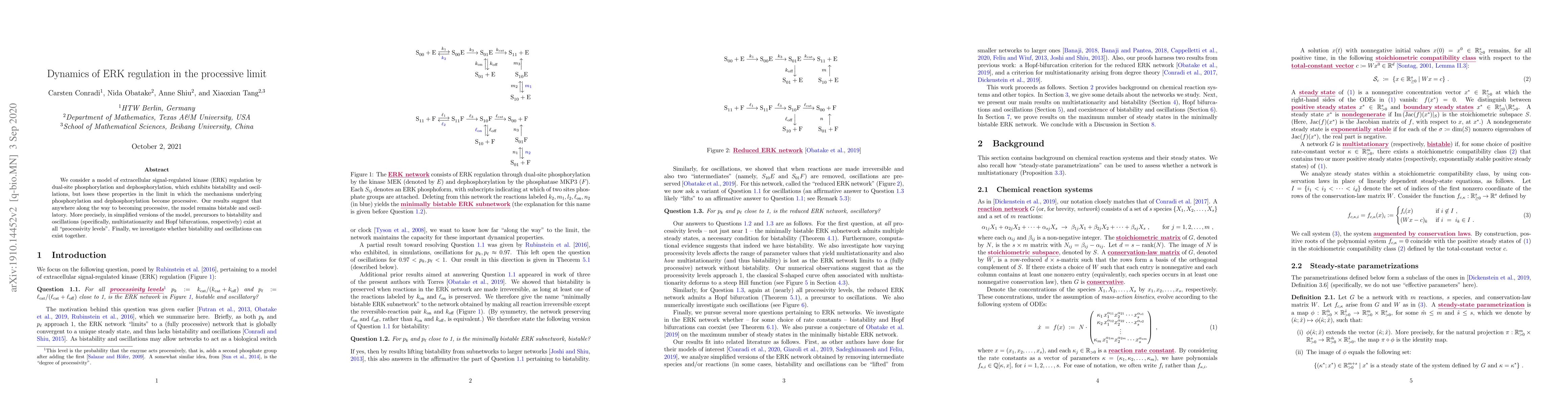 We consider a model of extracellular signal-regulated kinase (ERK) regulation by dual-site phosphorylation and dephosphorylation, which exhibits bistability and oscillations, but loses these properties in the limit in which the mechanisms underlying phosphorylation and dephosphorylation become processive. Our results suggest that anywhere along the way to becoming processive, the model remains bistable and oscillatory. More precisely, in simplified versions of the model, precursors to bistability and oscillations (specifically, multistationarity and Hopf bifurcations, respectively) exist at all "processivity levels". Finally, we investigate whether bistability and oscillations can exist together.