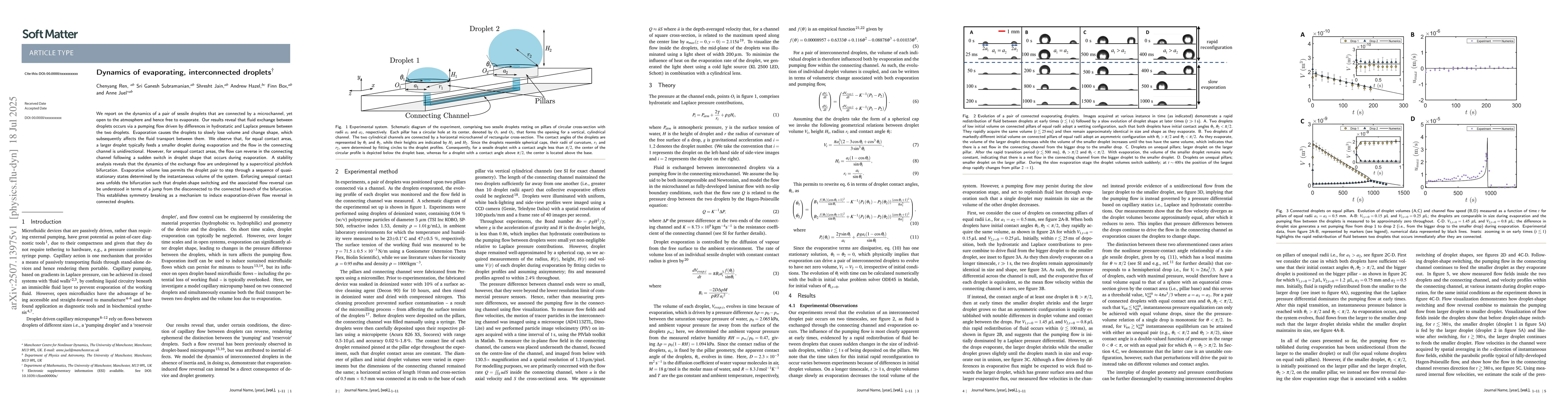 We report on the dynamics of a pair of sessile droplets that are connected by a microchannel, yet open to the atmosphere and hence free to evaporate. Our results reveal that fluid exchange between droplets occurs via a pumping flow driven by differences in hydrostatic and Laplace pressure between the two droplets. Evaporation causes the droplets to slowly lose volume and change shape, which subsequently affects the fluid transport between them. We observe that, for equal contact areas, a larger droplet typically feeds a smaller droplet during evaporation and the flow in the connecting channel is unidirectional. However, for unequal contact areas, the flow can reverse in the connecting channel following a sudden switch in dropletshape that occurs during evaporation. A stability,analysis reveals that the dynamics of the exchange flow are underpinned by a supercritical pitchfork bifurcation. Evaporative volume loss permits the droplet pair to step through a sequence of quasi-stationary states determined by the instantaneous volume of the system. Enforcing unequal contact area unfolds the bifurcation such that droplet-shape switching and the associated flow reversal can be understood in terms of a jump from the disconnected to the connected branch of the bifurcation. This establishes symmetry breaking as a mechanism to induce evaporation-driven flow reversal in connected droplets.